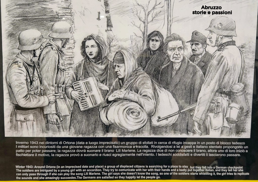 Il Museo di Ortona non è solo un luogo espositivo, ma anche di narrazione. Conserva storie di vita vissuta, piccoli frammenti di umanità emersi dall’orrore della guerra. Tra questi, la vicenda di un gruppo di sfollati che, nell’inverno del 1943, mentre cercava rifugio, fu fermato a un posto di blocco tedesco. Alla vista di una fisarmonica che una giovane portava a tracolla, i soldati le chiesero di suonare qualche nota di Lili Marleen. Tremante, la ragazza acconsentì: suonò poche battute, cercando di seguire il motivo musicale fischiettato dal soldato tedesco. Riuscì così a ottenere il lasciapassare per sé e per i compagni. Quella fisarmonica è esposta nel Museo.