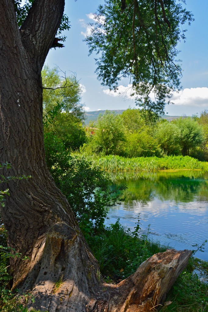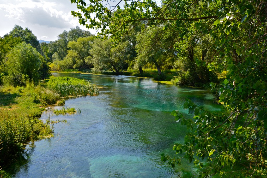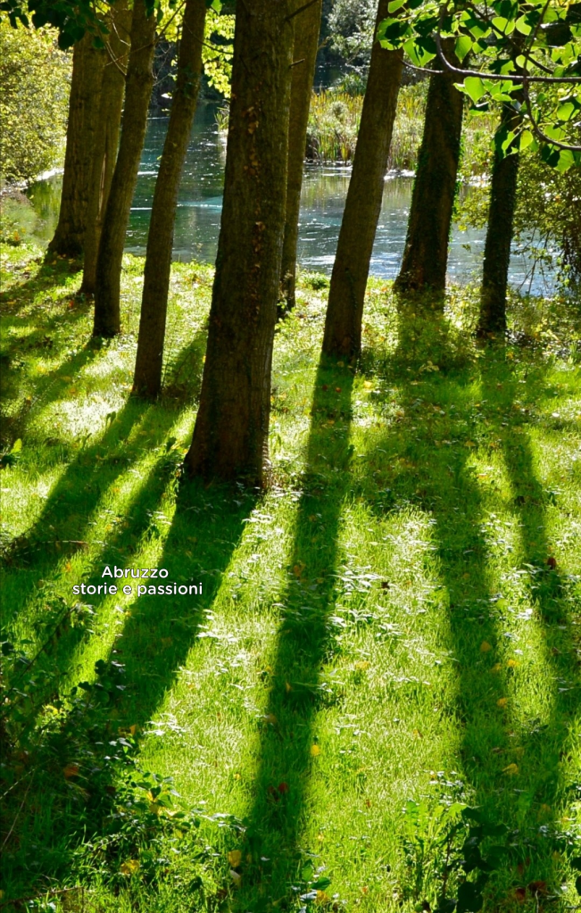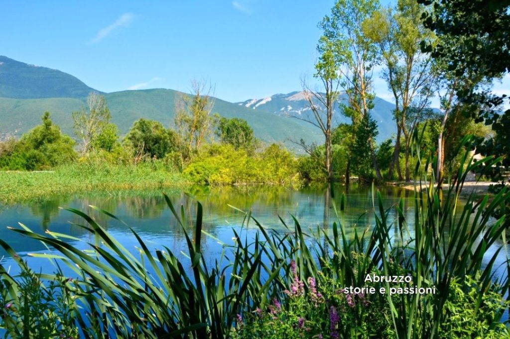 Lo specchio d’acqua è circondato da praterie assolate, apparentemente aride, punteggiate da sorgenti montane nascoste nella boscaglia, dalle acque gelide anche in piena estate. Considerato uno dei fiumi più belli d’Europa, il Tirino – dal greco Tritano, triplice sorgente – nasce infatti da tre polle principali. Non è improbabile che anche il toponimo Capestrano derivi da Caput trium amnium, ovvero “a capo di tre sorgenti”.