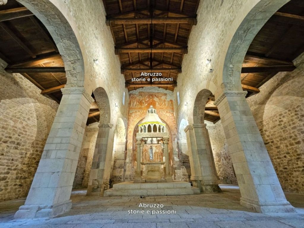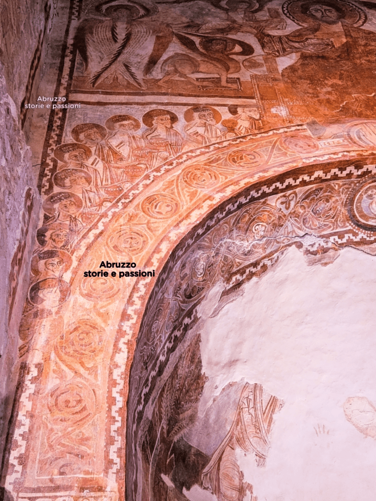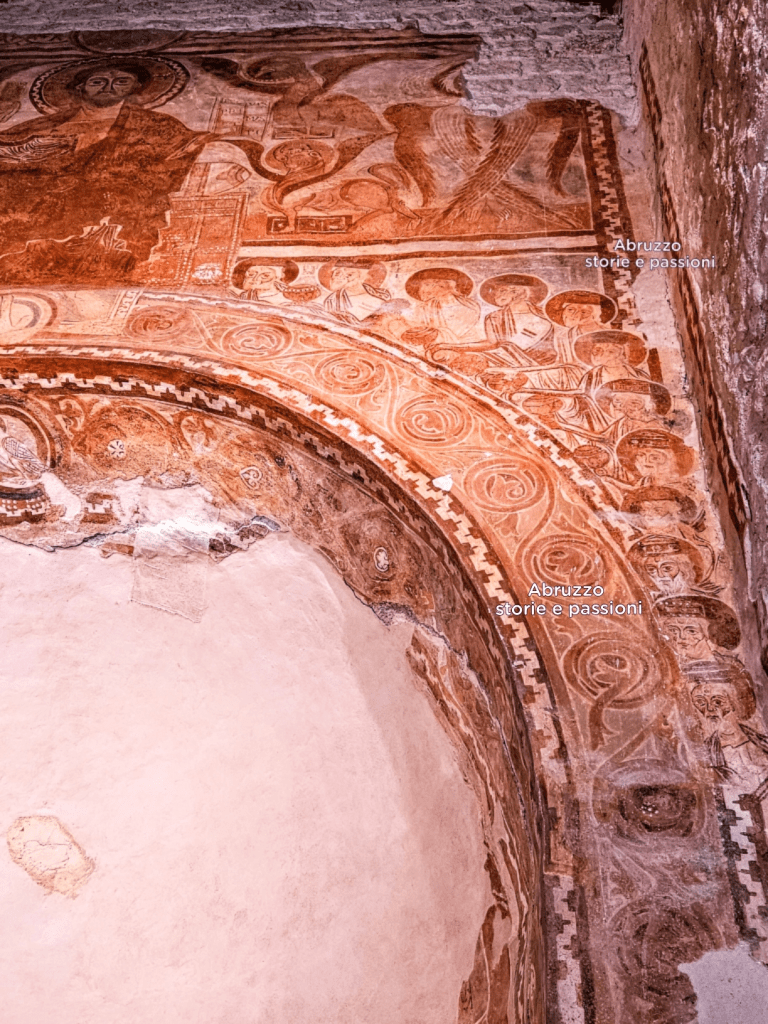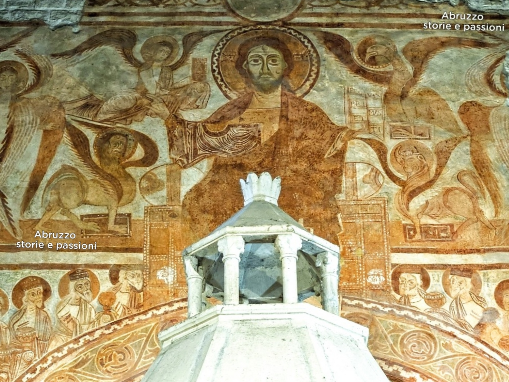 Forse è l’Agnello di Dio, che sembra prendere forma nella sfera celeste appena visibile sopra il Cristo benedicente alla greca. Ma non lo sapremo mai: quella parte degli affreschi, la più alta e spesso ignorata dai visitatori, è andata perduta nel tempo. Ciò che resta, tuttavia, è sufficiente a rendere gli affreschi di San Pietro ad Oratorium una testimonianza iconografica straordinaria, unica in Abruzzo (1).