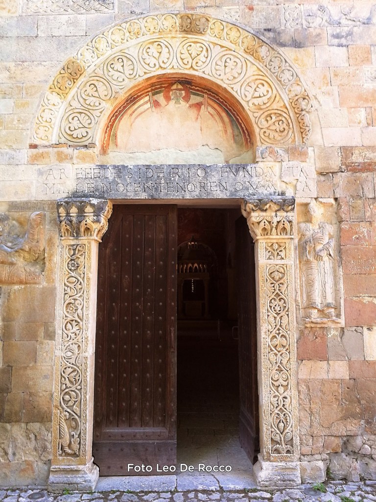 Sull’architrave del portale di San Pietro ad Oratorium si legge: A rege Desiderio fundata, anno milleno centeno renovata. L’archivolto e il portale sono decorati con raffinati motivi floreali, che ricordano i ricami del tombolo aquilano, e alludono alle simboliche lettere greche Alfa e Omega, principio e fine di ogni cosa.