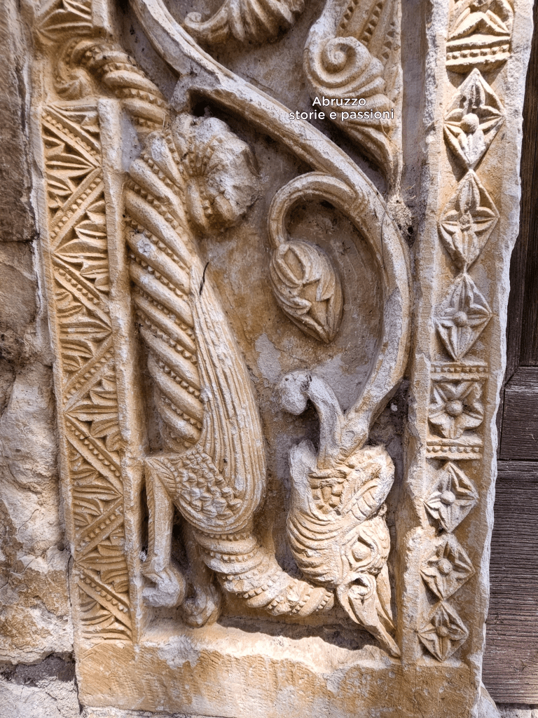 Tra le decorazioni spicca un drago singolare, dalle sue fauci non sgorgano fiamme, bensì tralci di vite. Non è un caso isolato poiché un suo gemello compare anche all’interno della chiesa, sull’architrave del ciborio. L’iconografia del drago, che chiamerei sputatralci, è ben attestata in Abruzzo: la ritroviamo a San Clemente a Casauria (ambone); sul portale della chiesa abbaziale di Santa Maria del Lago a Moscufo; a Pianella, nella chiesa abbaziale di Santa Maria Maggiore. Un linguaggio simbolico condiviso: la vittoria del bene sul male.