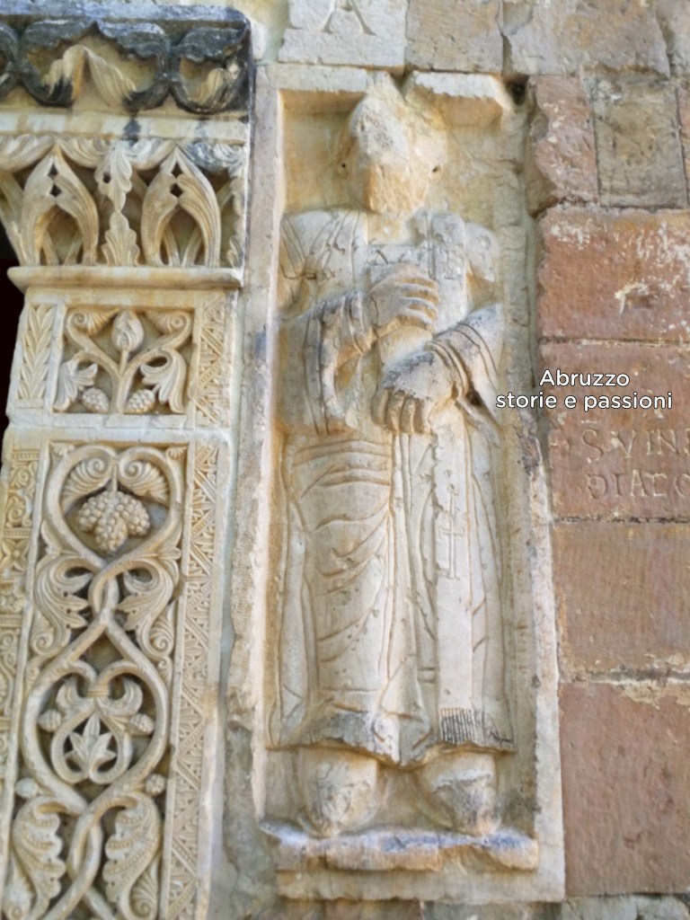 Capestrano, chiesa abbaziale di San Pietro ad Oratorium – Foto Abruzzo storie e passioni – dettaglio del portale: probabile immagine di un prelato (forse un abate) tratta da una lapide prelevata dall’antica cripta pertinente alla precedente chiesa