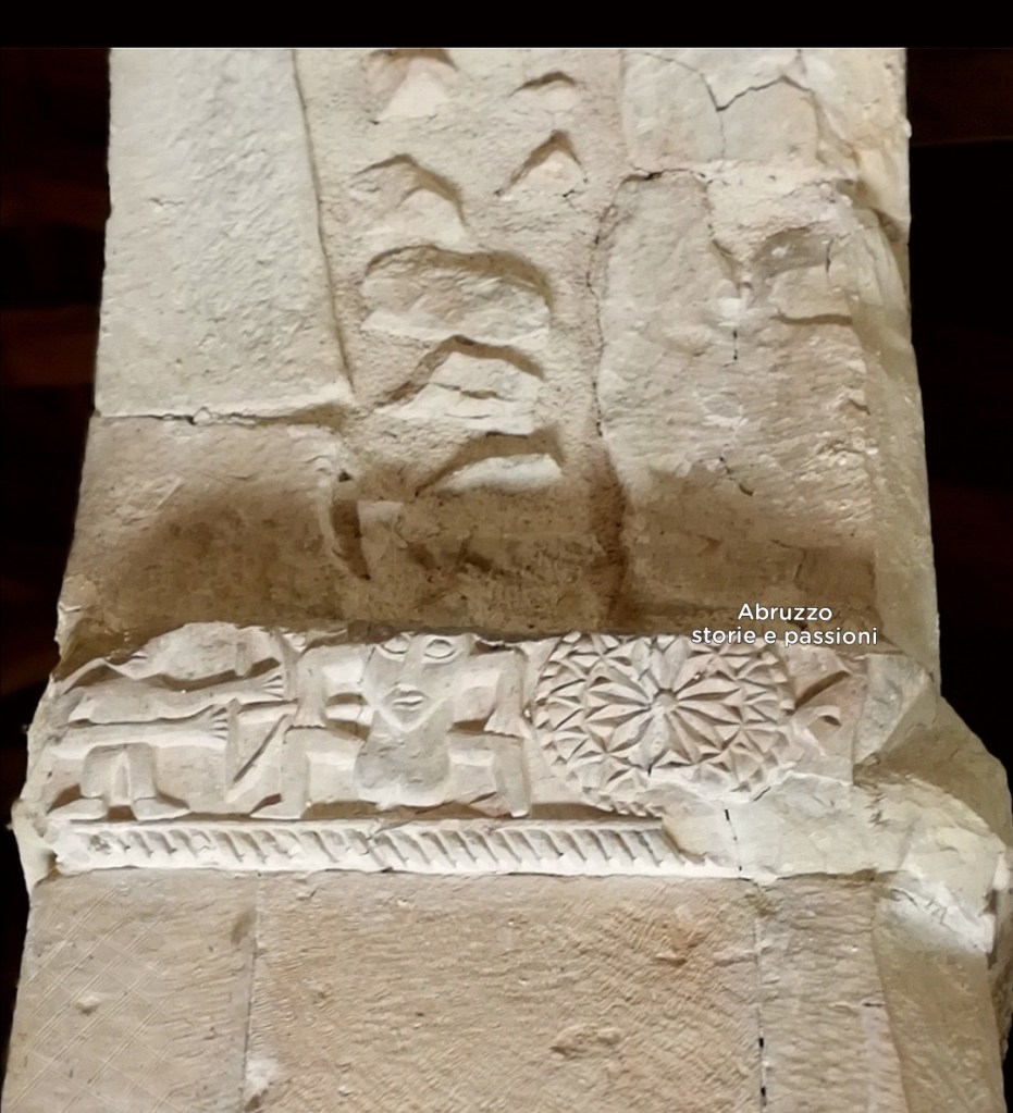Fonti: Museo Archeologico Nazionale Chieti; Comune di Capestrano, Pro Loco Capestrano – Note: 1) Dal Libro dell’Apocalisse: “Ed ecco c’era un trono nel cielo, e sul trono Uno stava seduto. Colui che stava seduto era simile nell’aspetto a diaspro e cornalina. Un arcobaleno simile a smeraldo avvolgeva il trono. Attorno al trono c’erano ventiquattro seggi e sui seggi sedevano ventiquattro anziani avvolti in candide vesti con corone d’oro sul capo. Dal trono uscivano lampi, voci e tuoni e ardevano sette fiaccole accese, che sono i sette spiriti di Dio. Davanti al trono vi era come un mare trasparente simile al cristallo. Attorno al trono vi erano quattro esseri viventi pieni d’occhi davanti e dietro. Il primo era simile a un leone; il secondo era simile a un vitello; il terzo aveva l’ aspetto come di un uomo; il quarto vivente era simile a un’aquila che vola. I quattro esseri viventi hanno ciascuno sei ali intorno e dentro sono costellati di occhi; giorno e notte non cessano di ripetere: Santo, santo, santo il Signore Dio, l’Onnipotente.” 2) La raffigurazione di due pavoni reali, o due volatili, oppure due animali fantastici, davanti a una coppa (cantharos) rientra in una diffusa iconografia medievale, simboleggia il rinnovamento spirituale e la Resurrezione.