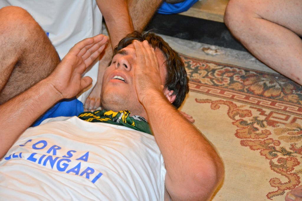 Ecco che arriva il vincitore, è un ragazzo di 20 anni, si chiama Alessio Marcaurelio e questa è la sua quinta vittoria consecutiva, un vero e proprio record! A mano a mano arrivano anche gli altri ragazzi tutti, come Alessio, esausti e provati. Molti hanno i piedi sanguinanti o escoriati, ma al dolore e alla stanchezza si associa l’emozione e la gioia per la prova superata e per la tensione ora finalmente sciolta. Tensione accumulata anche nei mesi che precedono la corsa in quanto, per acquisire forza e resistenza, i giovani si sono allenati. Tutti i partecipanti appena giunti al traguardo vengono subito assistiti da uno staff medico.