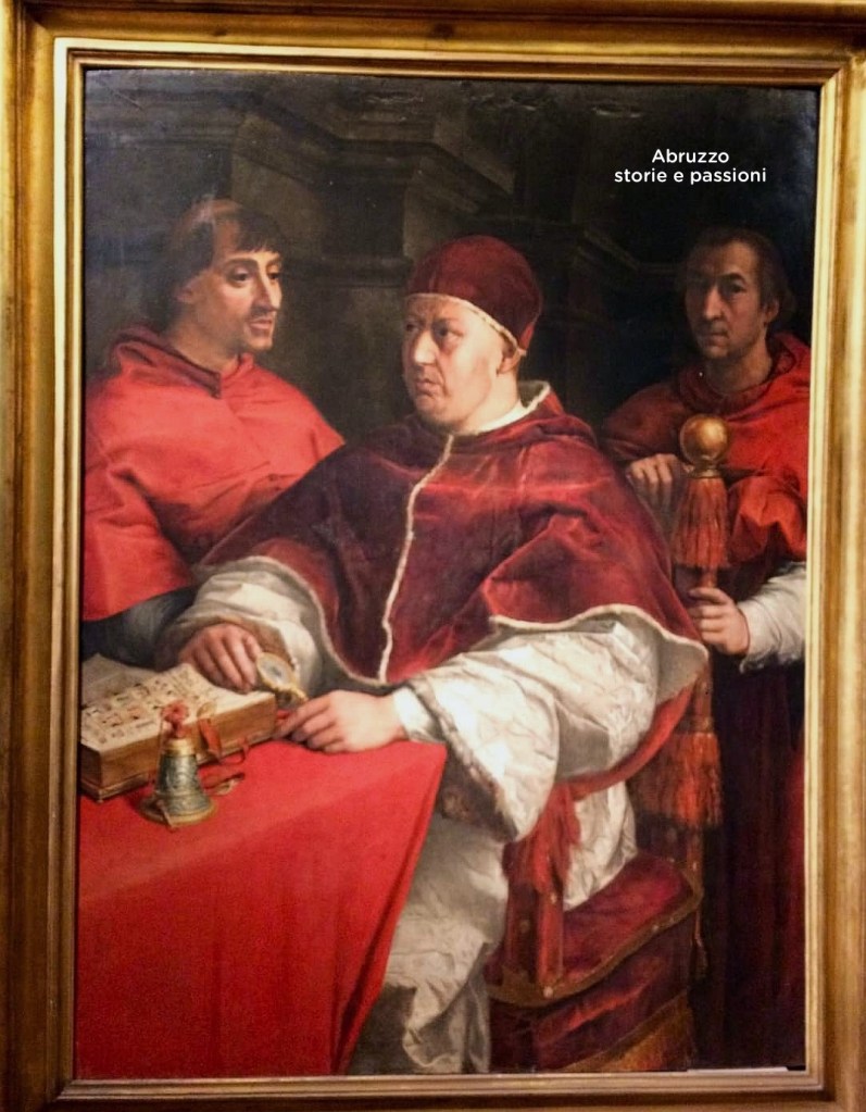 L’amico Raffaello immortalò poi il pontefice nel celebre ritratto conservato agli Uffizi: Leone X è affiancato dai cugini: a sinistra Giulio de’ Medici (futuro Clemente VII) figlio di Giuliano, il fratello di Lorenzo de’ Medici assassinato in Santa Maria del Fiore nel 1478; e a destra Luigi de’ Rossi, figlio di Maria de’ Medici.
