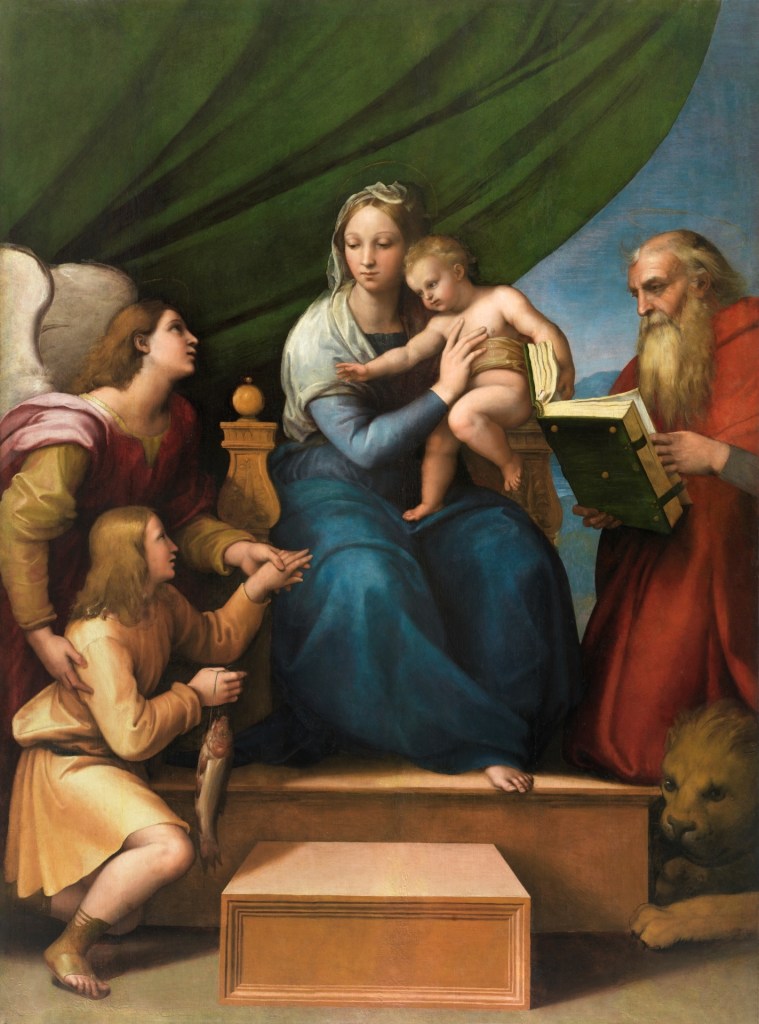 A sinistra, Filippo IV di Spagna ritratto da Diego Velàzquez, 1623, Meadows Museum Dallas – a destra, Madonna del Pesce, Raffaello Sanzio, 1513, Museo del Prado Madrid