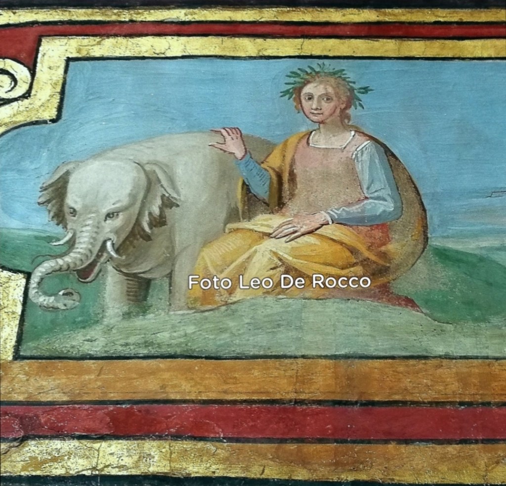 Giovanni Battista Branconio Aquilano, cameriere pontificio, preposto alla custodia dell’elefante, pose l’8 giugno 1516. Quel che la natura ci tolse, Raffaello con l’arte ci restituì.