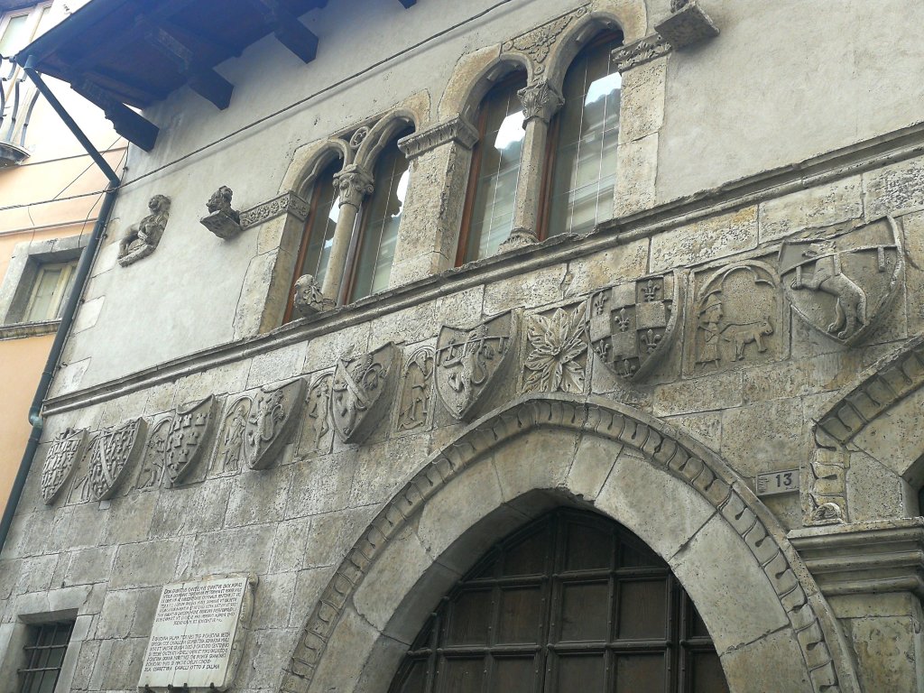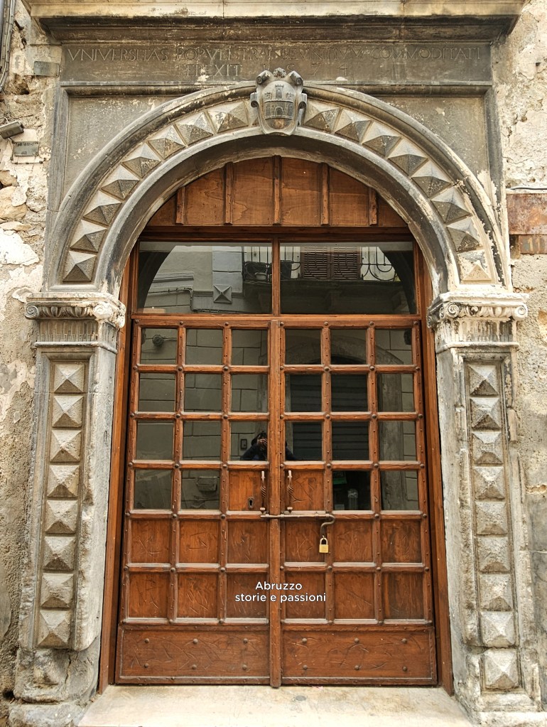 A sinistra il portale della Taverna Ducale, a destra quello della Taverna Nuova che reca lo stemma del Comune e la scritta “Universitas populi transeuntium commoditati 1574” (la Taverna a beneficio dei passanti 1574) – Foto Abruzzo storie e passioni