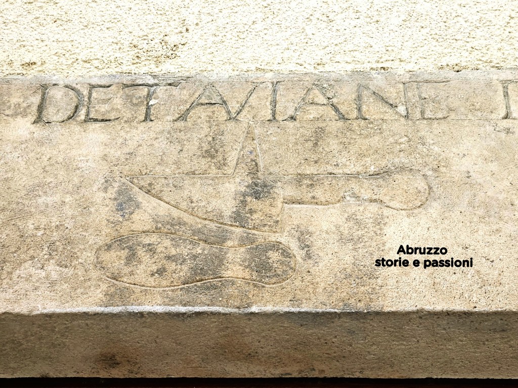 Popoli – Torre campanaria della chiesa di San Francesco, in basso l’ingresso al chiostro dell’ex convento francescano; stemma dell’Ordine francescano; dettagli del centro storico con l’insegna, datata 1574, di un calzolaio – Foto Abruzzo storie e passioni