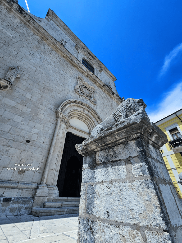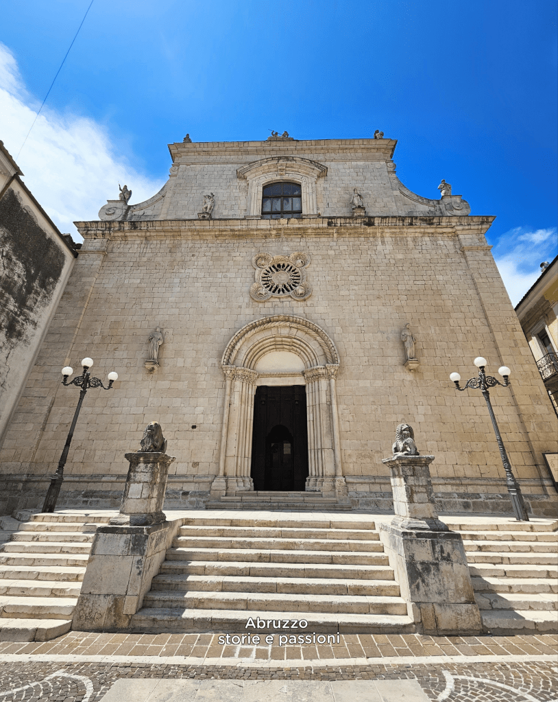 La facciata presenta una parte romanica (XIV sec.) e una barocca (restaurata nel 1688), ed è impreziosita da nove statue e da un quattrocentesco rosone, tra i più belli d’Abruzzo, sul quale sono scolpiti i simboli degli evangelisti: l’aquila per Giovanni, il toro per Luca, il leone per Marco e l’angelo per Matteo. Al centro campeggia lo stemma dei duchi Cantelmo, ripreso anche sulla facciata del campanile.