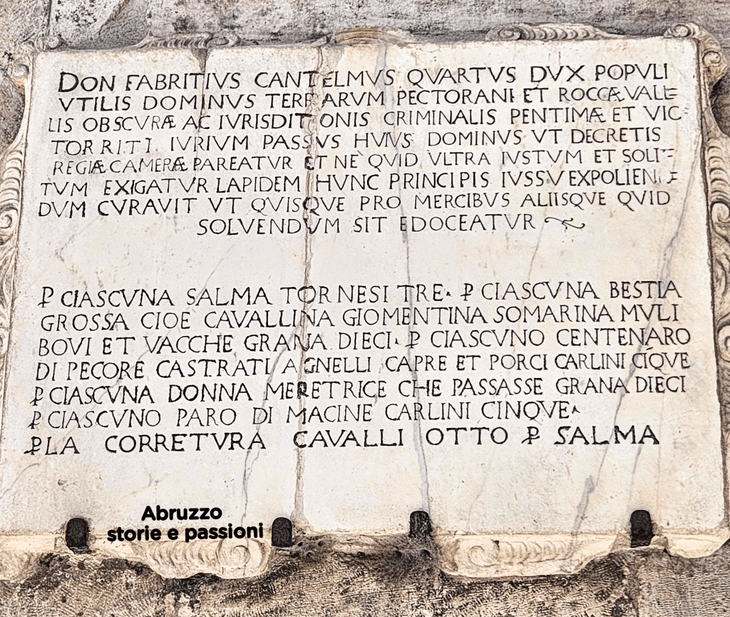Don Fabrizio Cantelmo, quarto duca di Popoli, signore utile delle terre di Pettorano e di Rocca Valle Scura e titolare della giurisdizione criminale di Pentima e Vittorito, signore dei diritti di questo passaggio, affinché si obbedisca ai decreti della regia Camera e non si esige alcunché oltre il giusto e il solito, fece incidere questa lapide per ordine del principe, di modo che ciascuno sia informato di quanto si debba pagare per le merci e altri beni (2).