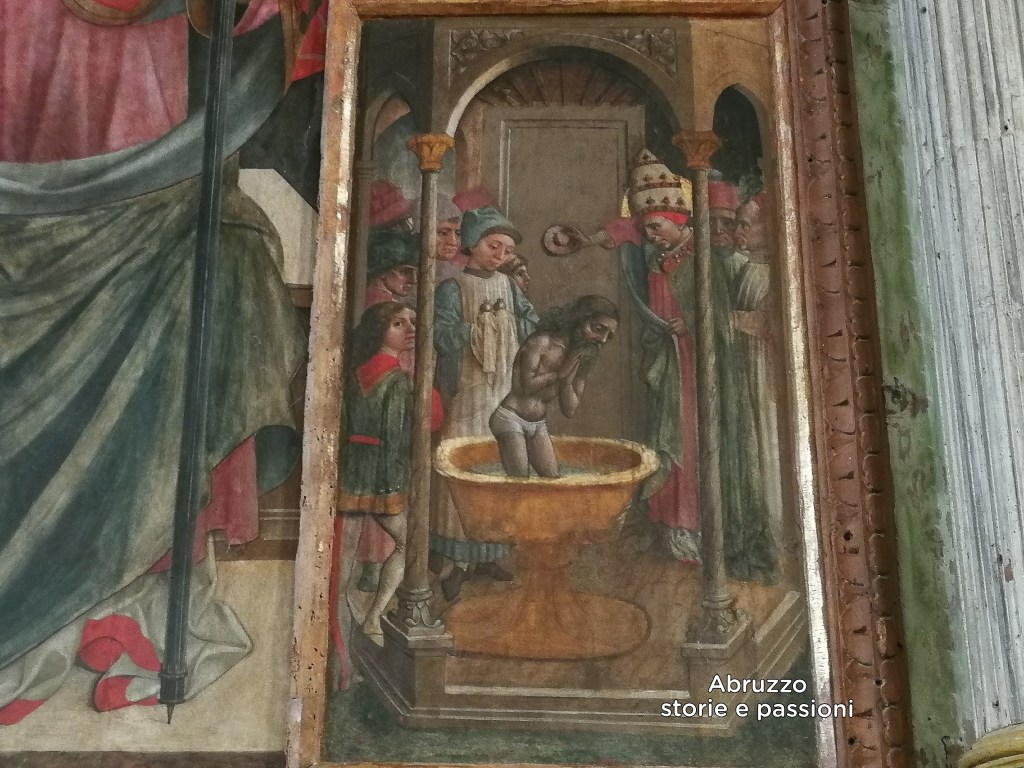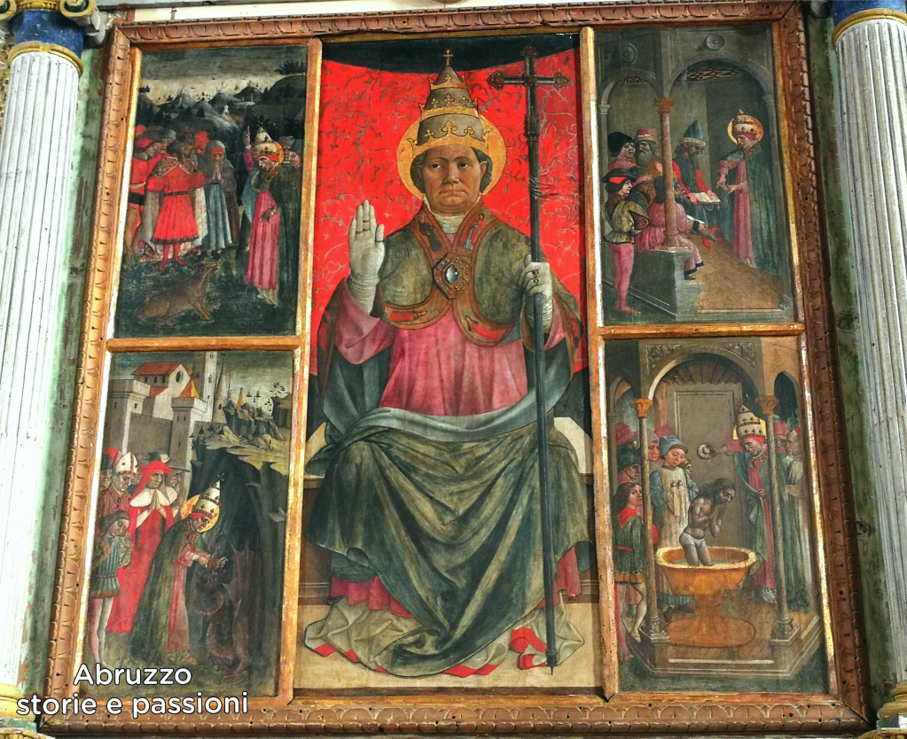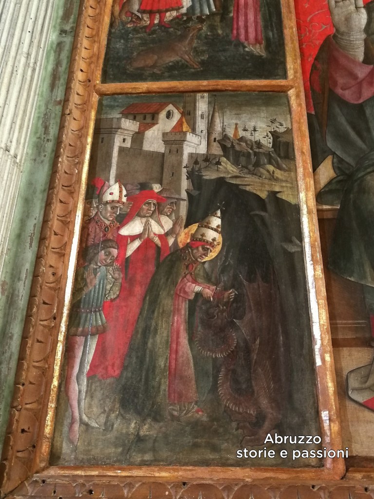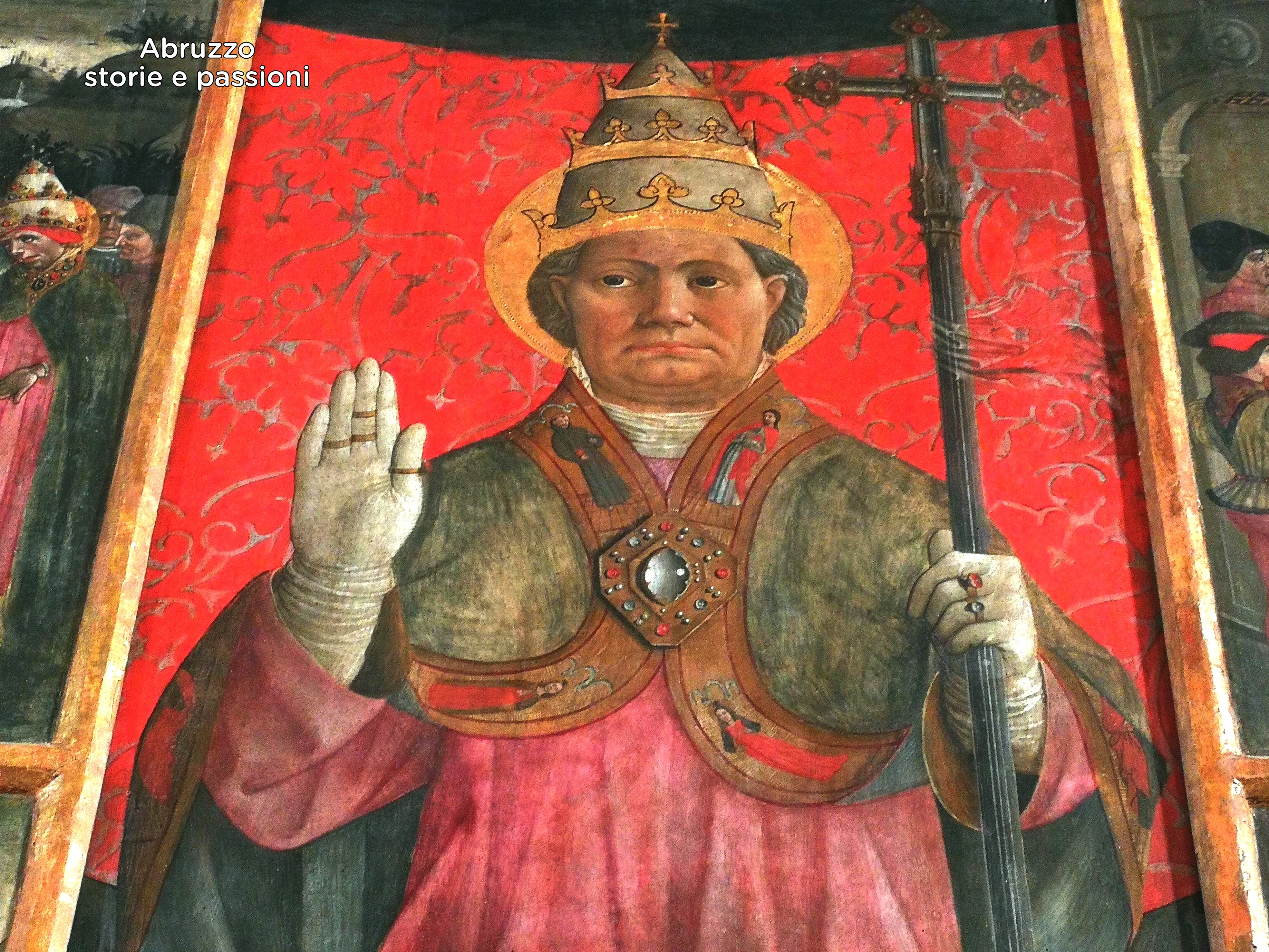 Mutignano, chiesa di San Silvestro papa – dettaglio della pala d’altare di Andrea de Litio: papa Silvestro I con il Triregno – Foto Leo De Rocco – le altre scene rappresentano: battesimo dell’Imperatore Costantino; Silvestro I e il drago.