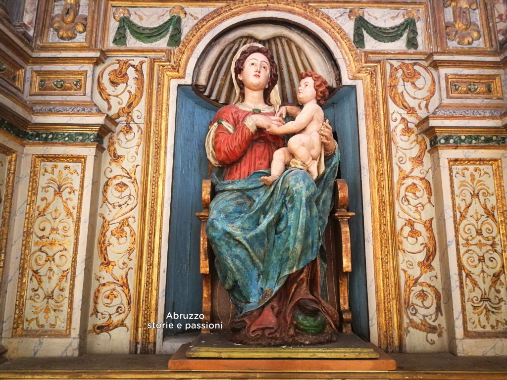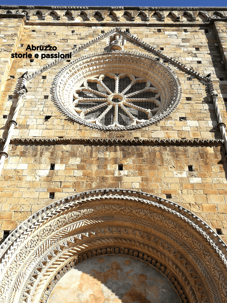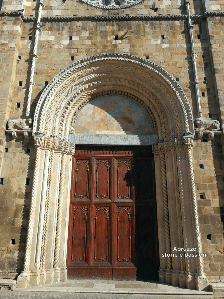 Il portale principale – uno dei simboli del gotico abruzzese – accoglie nella lunetta un affresco raffigurante l’Assunzione di Maria. Il rosone è composto da dodici raggi ed è sovrastato dalla statua della Madonna in trono con Bambino risalente al XIII secolo. A destra del portale si scorgono i resti di un grande affresco, forse databile al XIII secolo, raffigurante San Cristoforo, patrono dei viaggiatori e dei pellegrini. Una iconografia diffusa nella regione, la ritroviamo sulla facciata laterale della Collegiata di Guardiagrele (come abbiamo visto opera datata e firmata da Andrea de Litio); sulla controfacciata dell’oratorio di San Pellegrino a Bominaco; a Scanno, sulla facciata della chiesa di San Rocco, resa celebre da un iconico scatto di Henri Cartier- Bresson; e su una colonna della navata centrale della chiesa abbaziale di San Tommaso Becket a Caramanico.