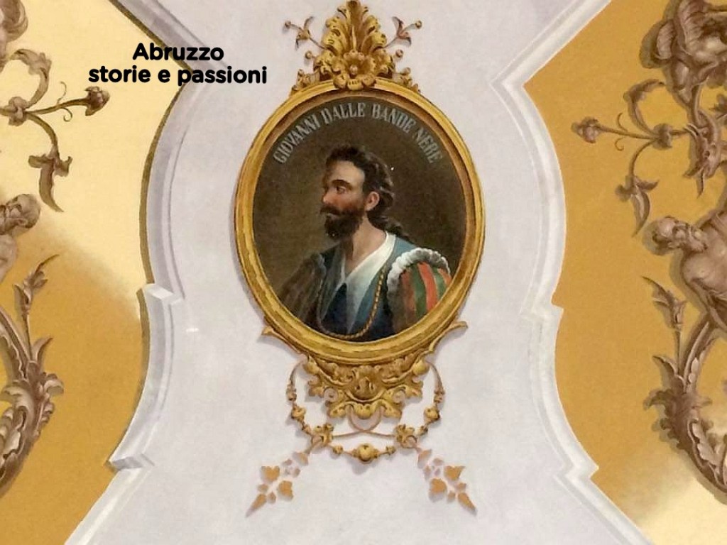 Palazzo Ducale di Atri, cortile d’onore e pozzo quattrocentesco – dettaglio decorazioni ottocentesche, Giovanni dalle Bande Nere, al secolo Ludovico de’ Medici, ritratto sulla volta di un salone – Foto Leo De Rocco per Abruzzo storie e passioni