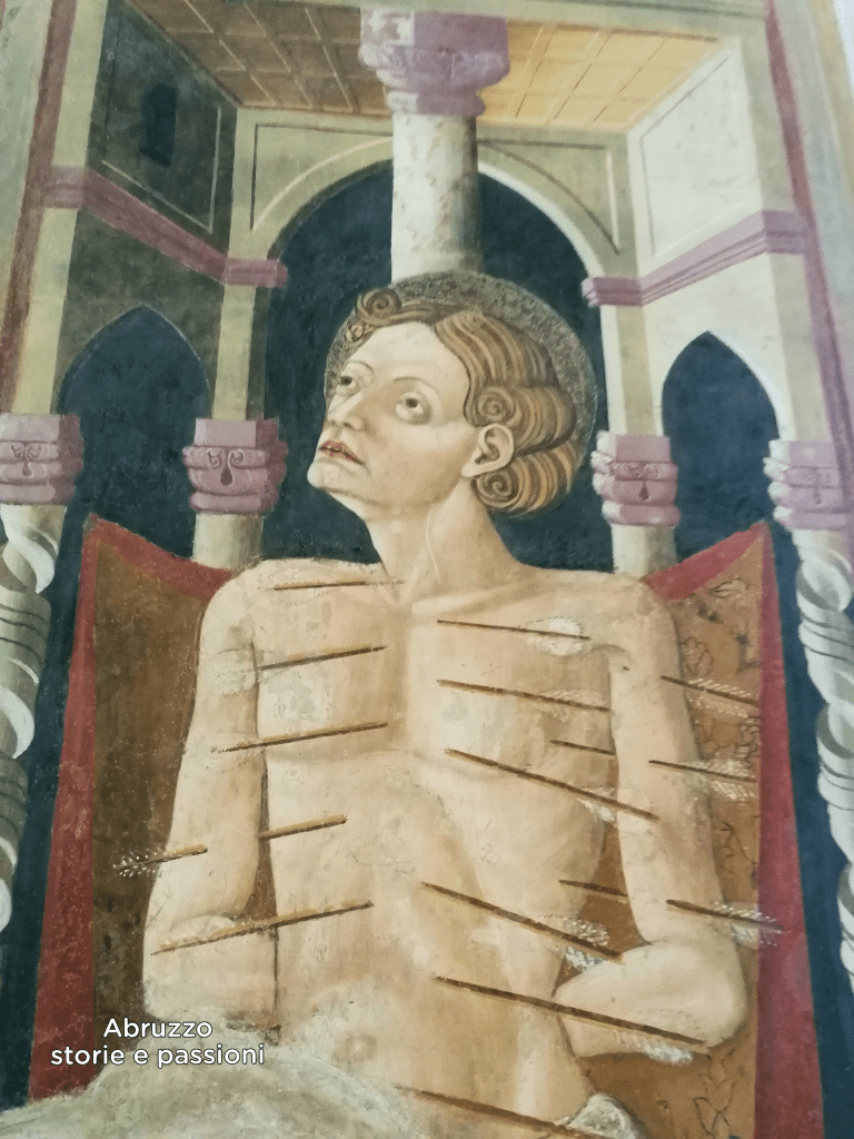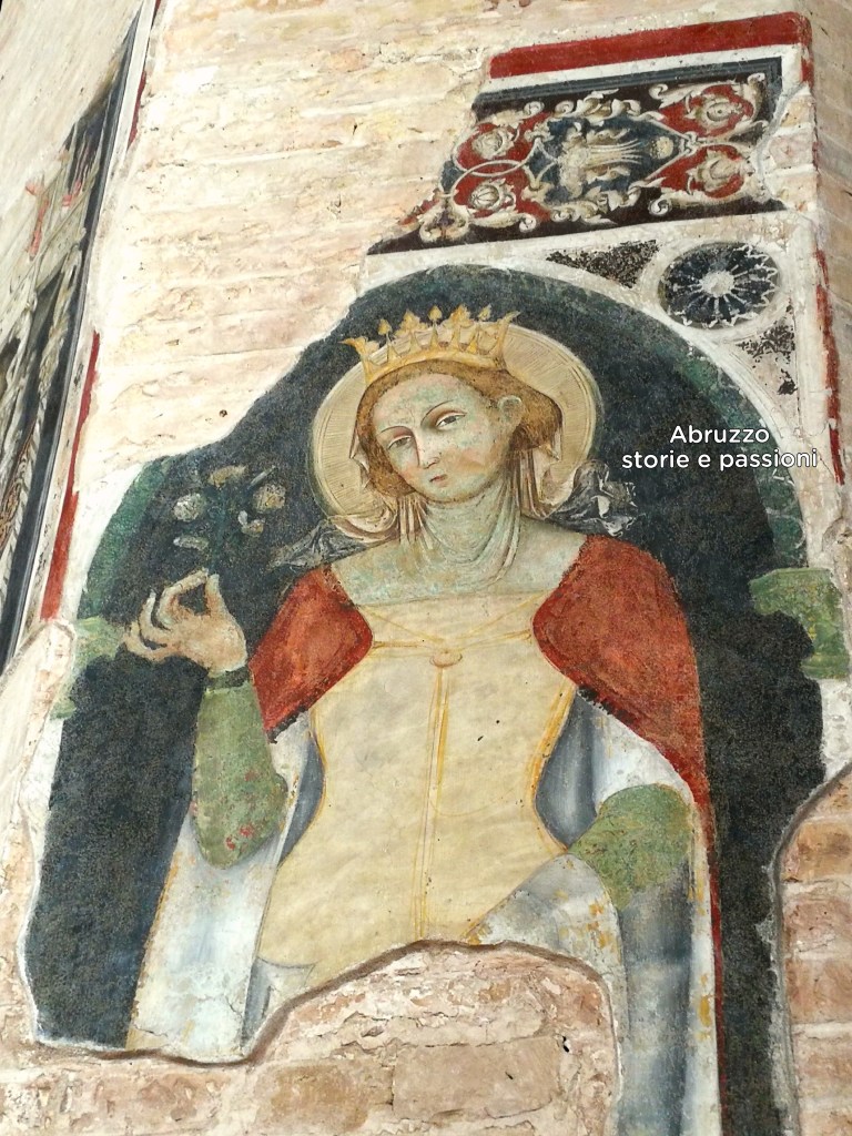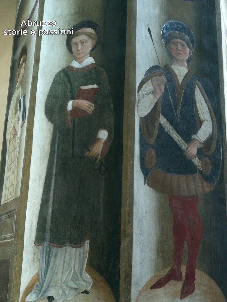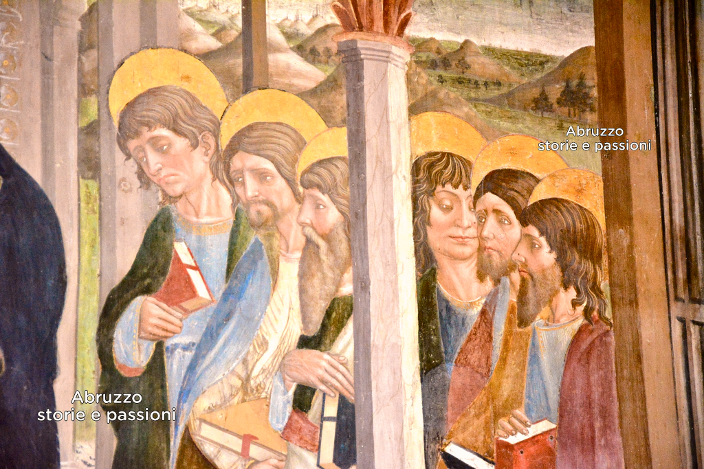Gli altri affreschi, distribuiti sulle colonne delle navate e sulle pareti laterali, testimoniano lo stile e il percorso artistico delle botteghe dei due artisti della Scuola di Atri, fino a ricongiungersi con il capolavoro del magister Andrea de’ Litio, annunciato dalla sua Madonna d’alto Mare affrescata sulla parete di sinistra, in prossimità del presbiterio.