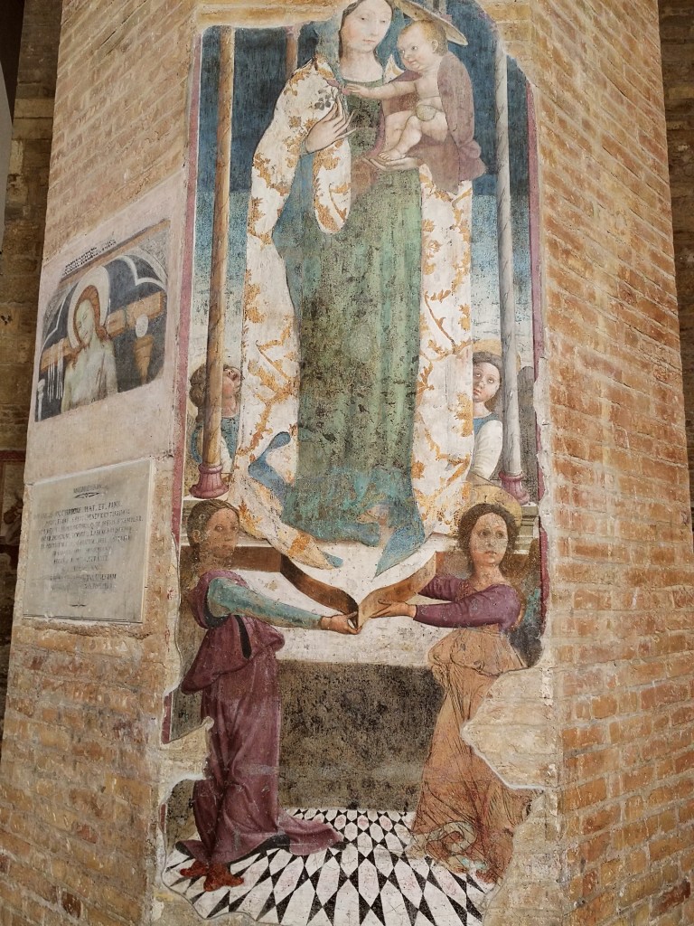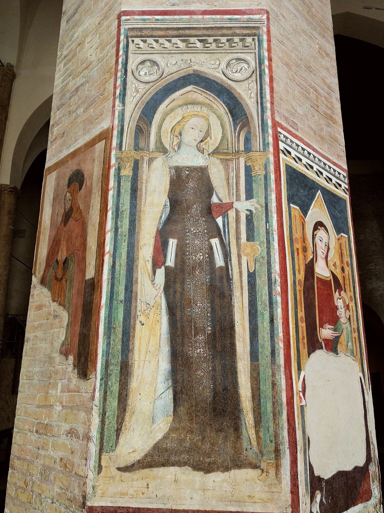 Atri – Duomo, apparato pittorico pareti e colonne – Foto Leo De Rocco per Abruzzo storie e passioni ‐ In particolare si evidenzia l’ultima foto, relativa ad una Madonna con Bambino dipinta da Andrea de Litio nel 1465 su una colonna della navata centrale.