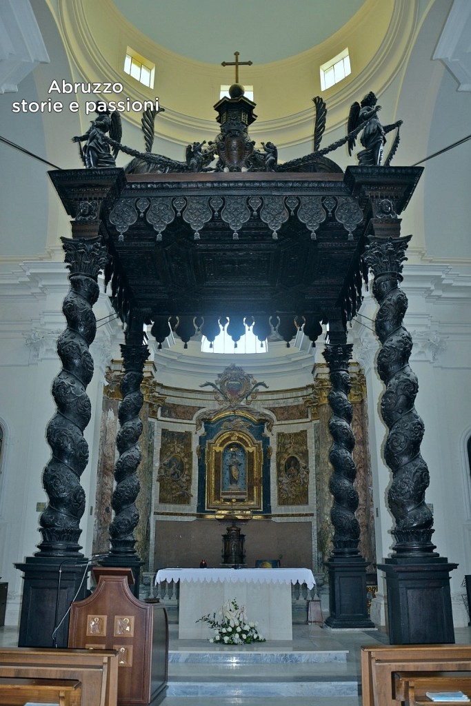 Il nostro Carlo rimase talmente affascinato di fronte all’iconico baldacchino bronzeo di San Pietro che, anni dopo, al suo ritorno in Abruzzo, decise di omaggiare il maestro e dimostrare l’abilità acquisita: ne realizzò uno gemello, ovviamente più piccolo e in legno. Fu collocato prima nel Duomo poi, in occasione di alcuni lavori, fu spostato nella vicina chiesa di Santa Reparata.