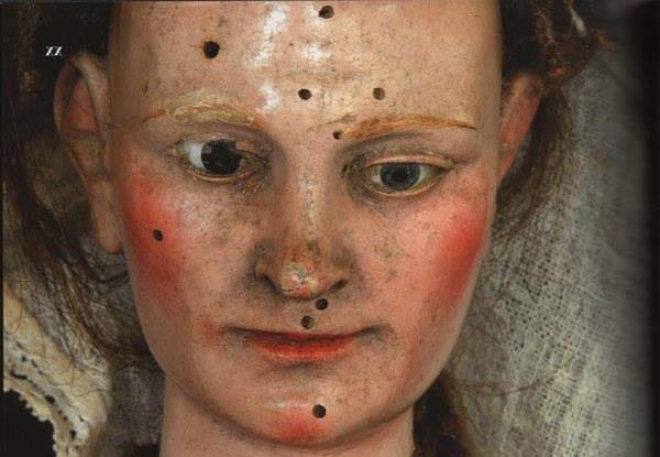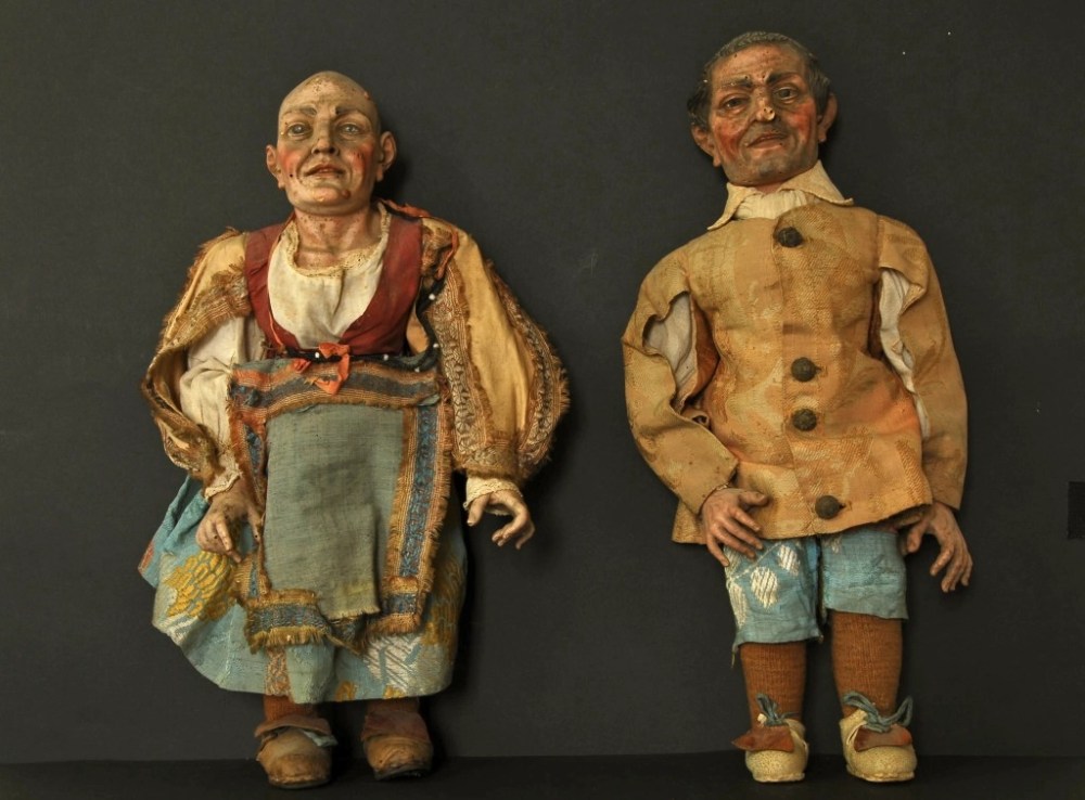 Statuine abbigliate con tessuti preziosi, scarpine di cuoio e collane di corallo.