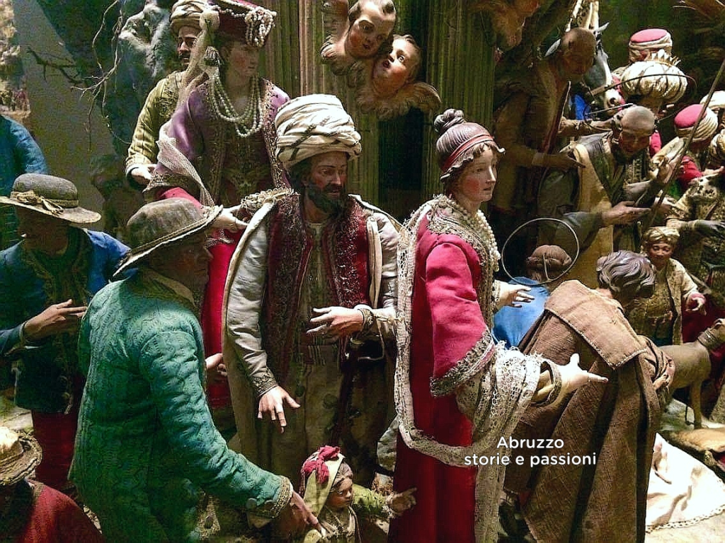Di epoca tardo seicentesca, questo presepe – spiega de Crecchio ad Abruzzo storie e passioni – deve la sua eccezionalità alle fattezze dei figuranti: non si tratta di gente del popolo, storpi, vaiasse di umidi rioni, straccioni e servi, ma di personaggi della ricca borghesia, finemente abbigliati, con capelli veri, occhi di cristallo, calzature e persino biancheria intima. Una riproduzione fedele – conclude lo studioso – di ciò che le famiglie nobili dell’epoca rappresentare nella loro immagine di Natività.