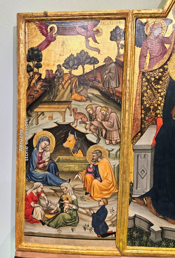 Dettaglio del Trittico di Beffi – MuNDA L’Aquila – In primo piano la mangiatoia e il primo bagnetto di Gesù Bambino. In alto è raffigurato uno zampognaro – Leonardo Sabino da Teramo noto come Maestro di Beffi, inizi del XV secolo – Foto Leo De Rocco per Abruzzo storie e passioni