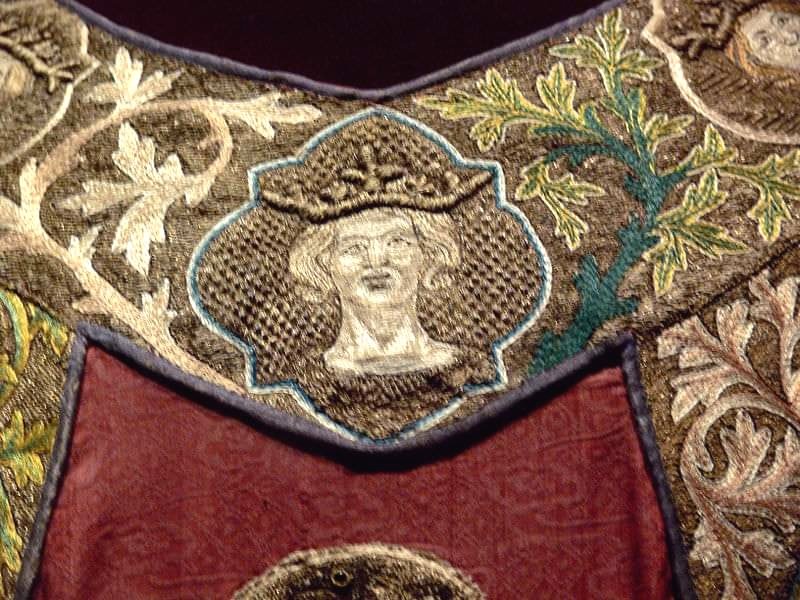 Tra i capi del corredo reale hanno attirato la mia attenzione i medaglioni ricamati sui bordi (sulla scollatura) di una tunica-dalmatica, chiamata Aquila dalmatica (foto sotto), citata per la prima volta nel 1350. Questi ricami a medaglione, all’interno dei quali appaiono i ritratti di regnanti, uomini di alto rango e prelati, sono molto simili, quasi identici, ai medaglioni ricamati sulla Casula di Lanciano. La loro forma richiama lo stile medievale delle cornici utilizzate dai miniaturisti e dalle antiche botteghe orafe, soprattutto nella produzione di croci processionali nell’ambito dello stile Gotico Internazionale.