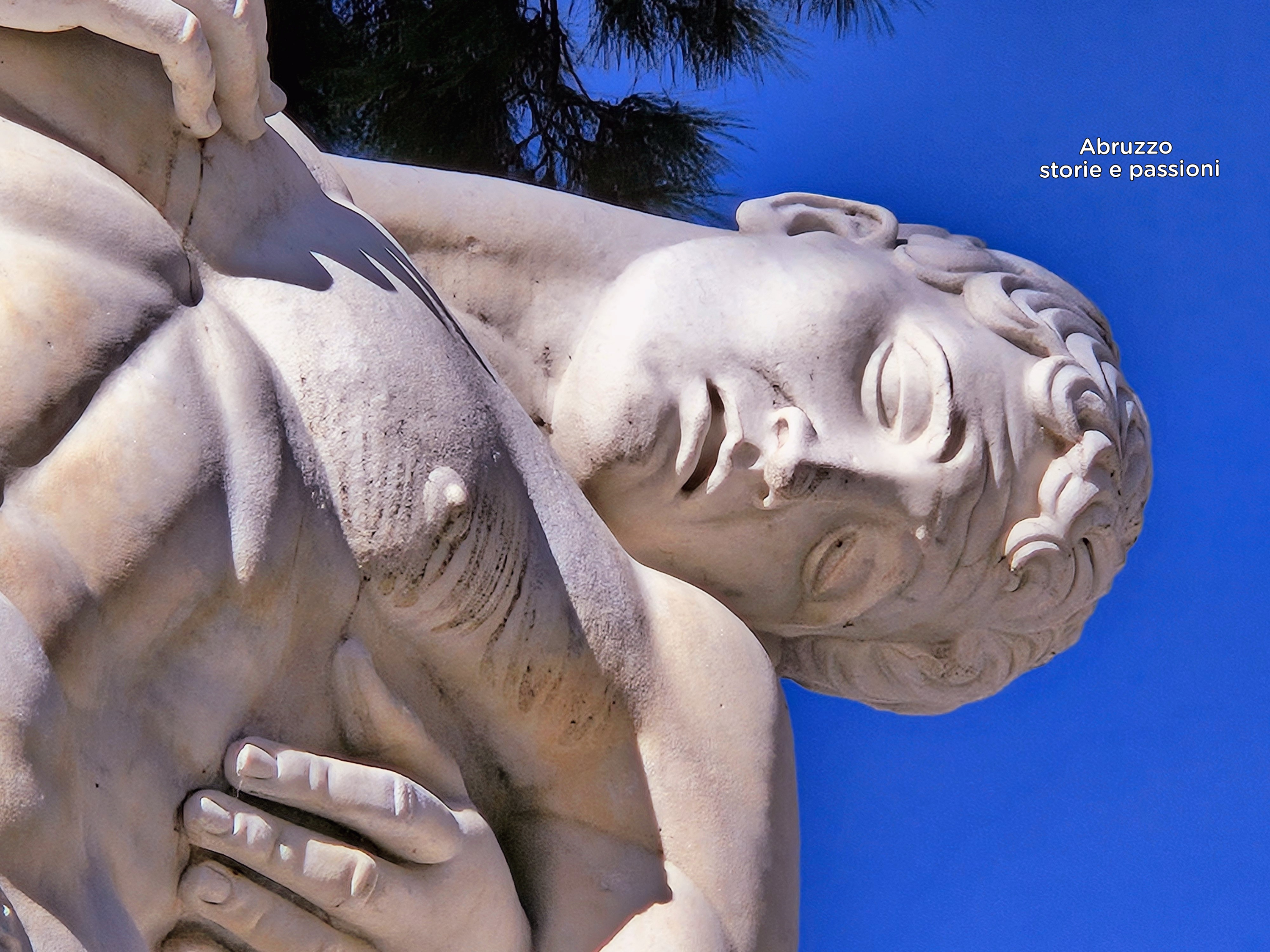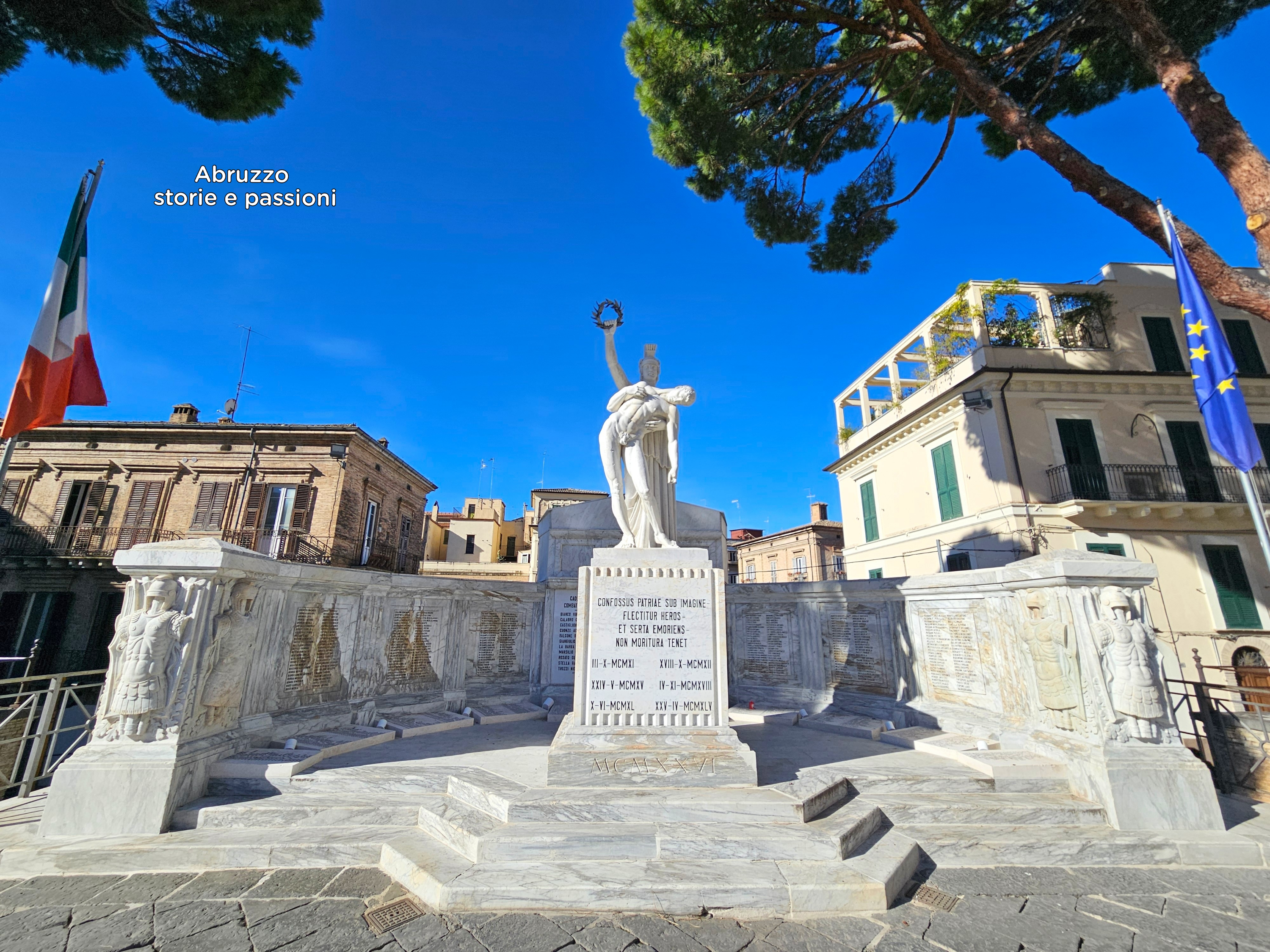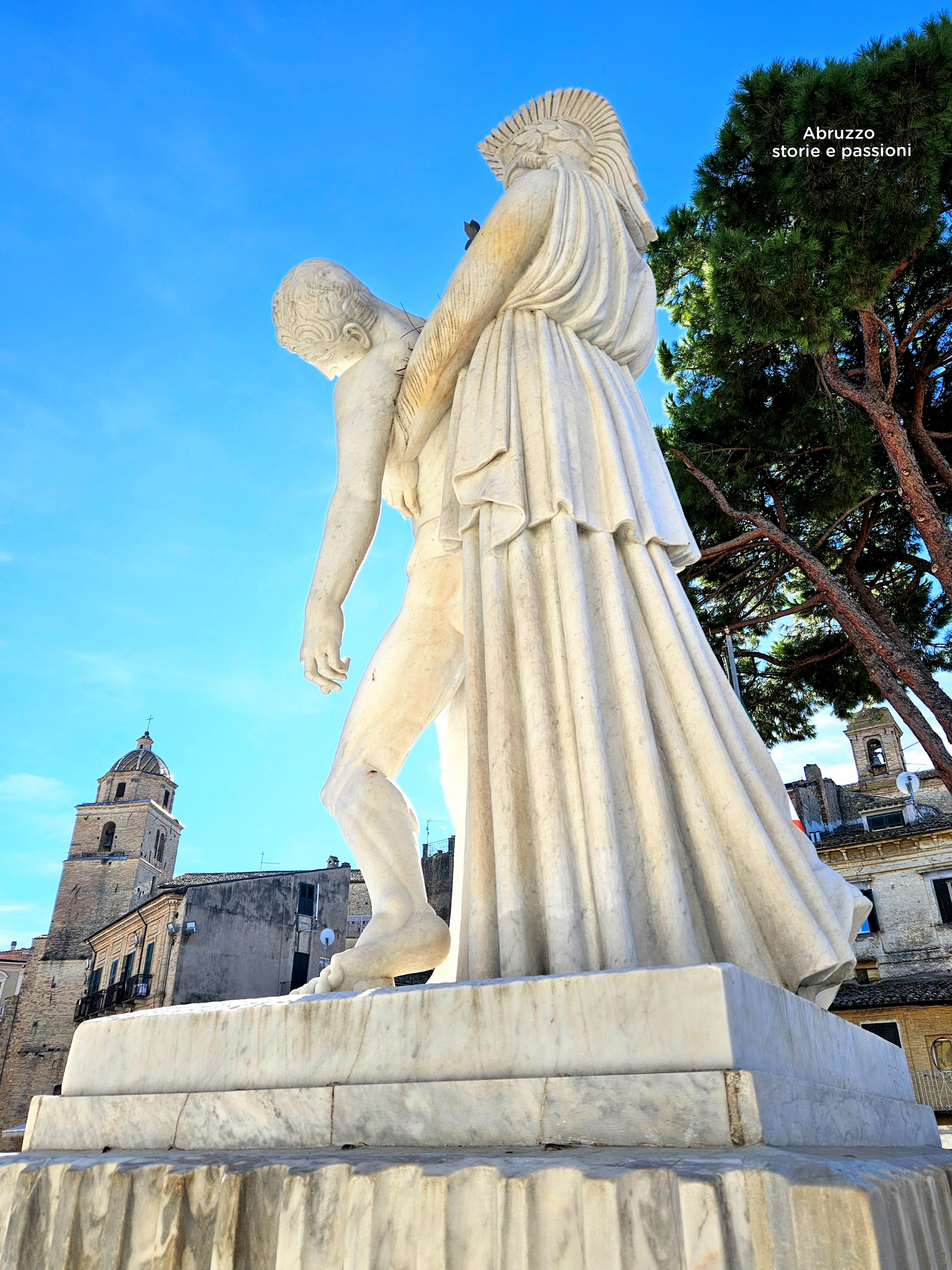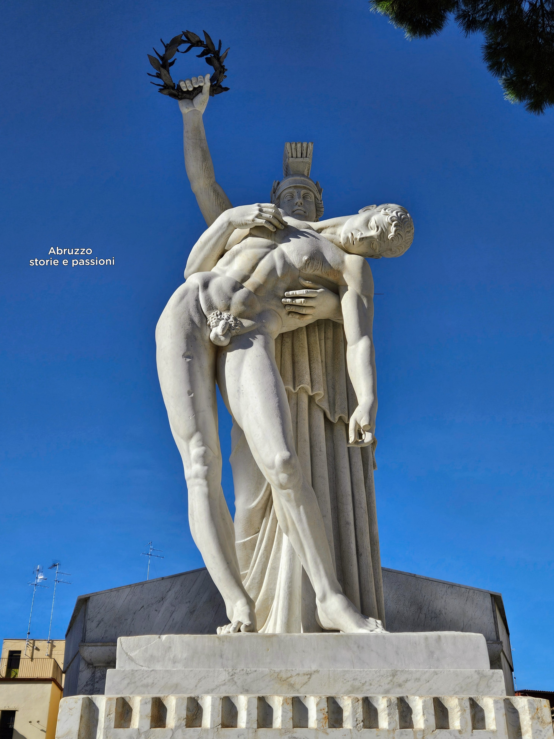 Lanciano, piazza Plebiscito, Monumento ai Caduti, 1926, Amleto Cataldi – Foto Leo De Rocco – il gruppo scultoreo raffigura la vittoria, nelle vesti di Atena che, sollevando una corona d’alloro in bronzo, sostiene un soldato morente rappresentato con i tratti ispirati all’ideale classico dell’eroe.