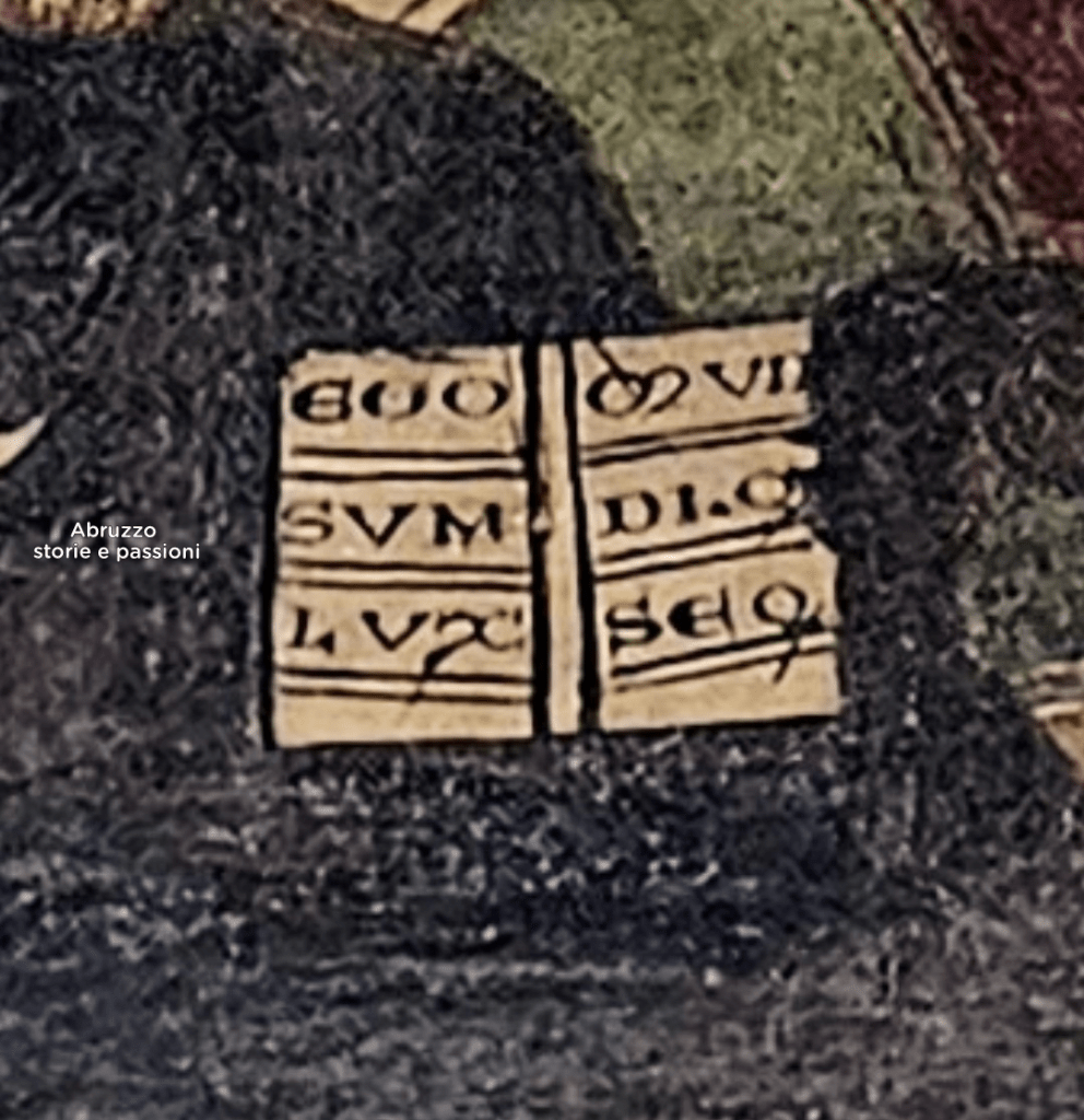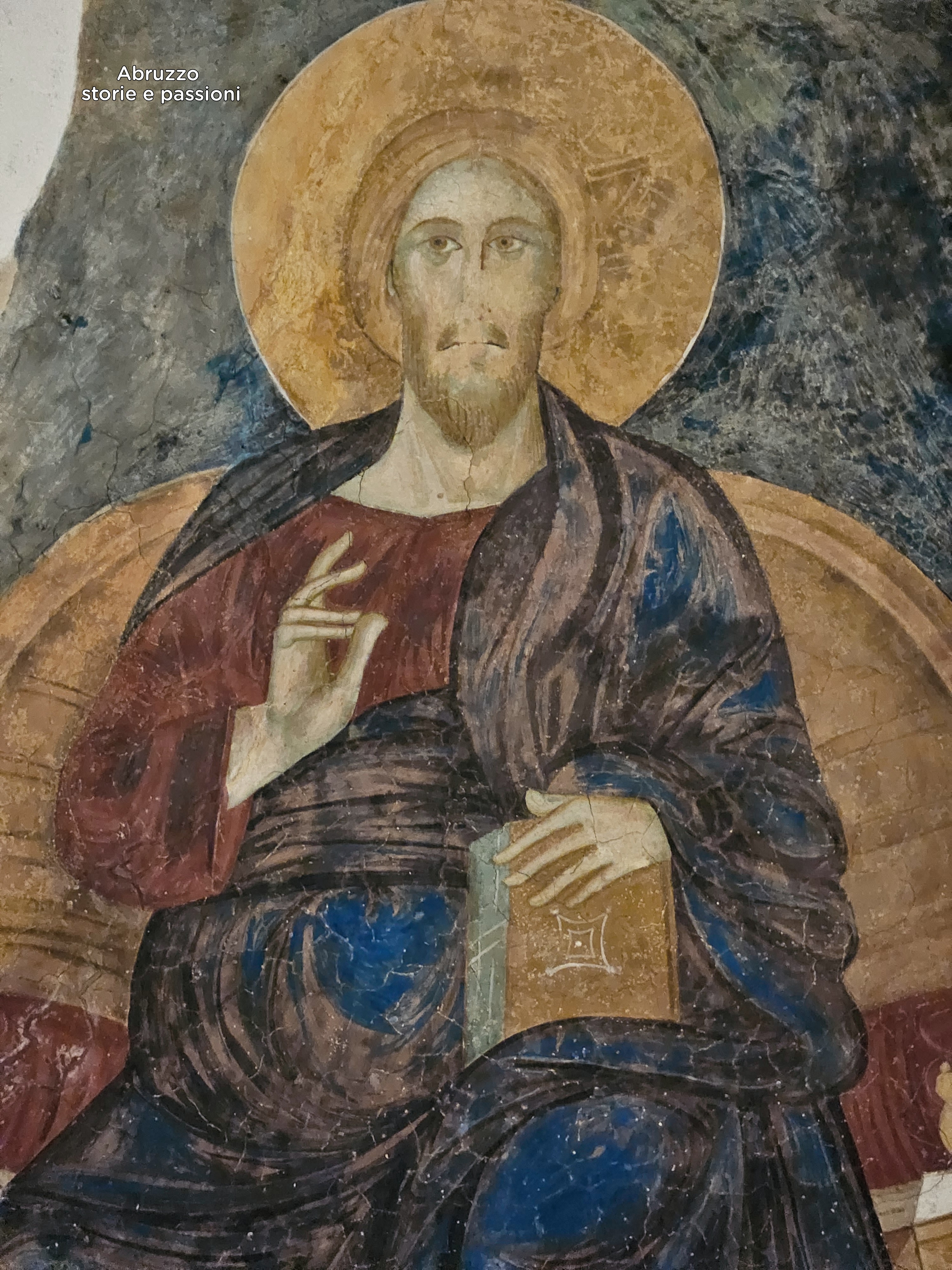 Nell’abside centrale domina la figura maestosa di Cristo in trono, affiancato da due angeli e dai santi Giovanni Battista e Benedetto. Ai loro piedi, inginocchiato, si intravede un monaco identificato come “Provenzanus”. Ognuno dei personaggi regge nella mano sinistra un cartiglio con le sacre parole: Cristo: “Ego sum lux mundi qui sequitur me non ambulat in tenebris et habebit lumen vitae. Ego sum alfa et omega” – “Io sono la luce del mondo. Chi segue me non camminerà nelle tenebre e avrà la luce della vita. Io sono il principio e la fine”. San Giovanni Battista: “Ecce agnus Dei. Ecce qui tollit peccata mundi” – “Ecco l’agnello di Dio. Ecco chi toglie i peccati del mondo”.