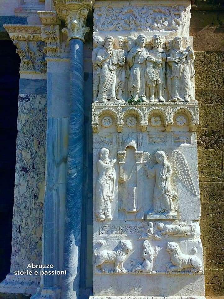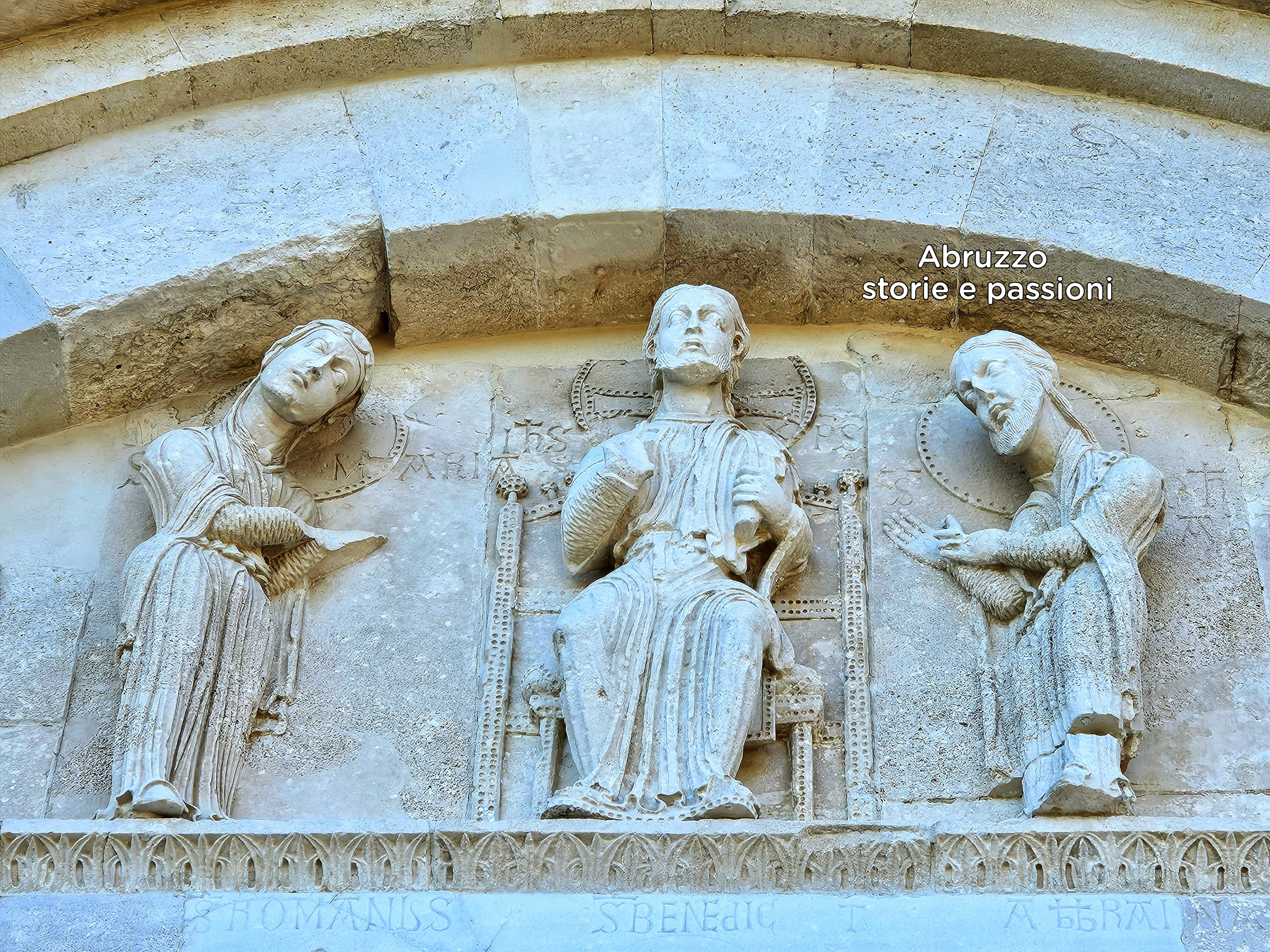 Il portale di San Giovanni in Venere è sormontato da una lunetta che raffigura Cristo in trono, affiancato dalla Madonna e da San Giovanni Battista. Restano, sparsi e in parte disordinati, i frammenti di altre statue, mentre un’iscrizione richiama San Romano, San Benedetto e l’abate Rainaldo. Tra il 1224 e il 1230 fu proprio quest’ultimo a curare la ristrutturazione della facciata, probabilmente a seguito dei danni causati da un terremoto, che colpì in particolare la lunetta e la sua statuaria. L’abate Rainaldo supervisionò anche la sistemazione dei grandi registri di bianca roccia arenaria, istoriati con citazioni bibliche, iconografie romaniche e numerosi episodi della vita di San Giovanni Battista, scolpiti oltre vent’anni prima sotto la guida del suo predecessore, l’abate Oderisio (1165–1204).