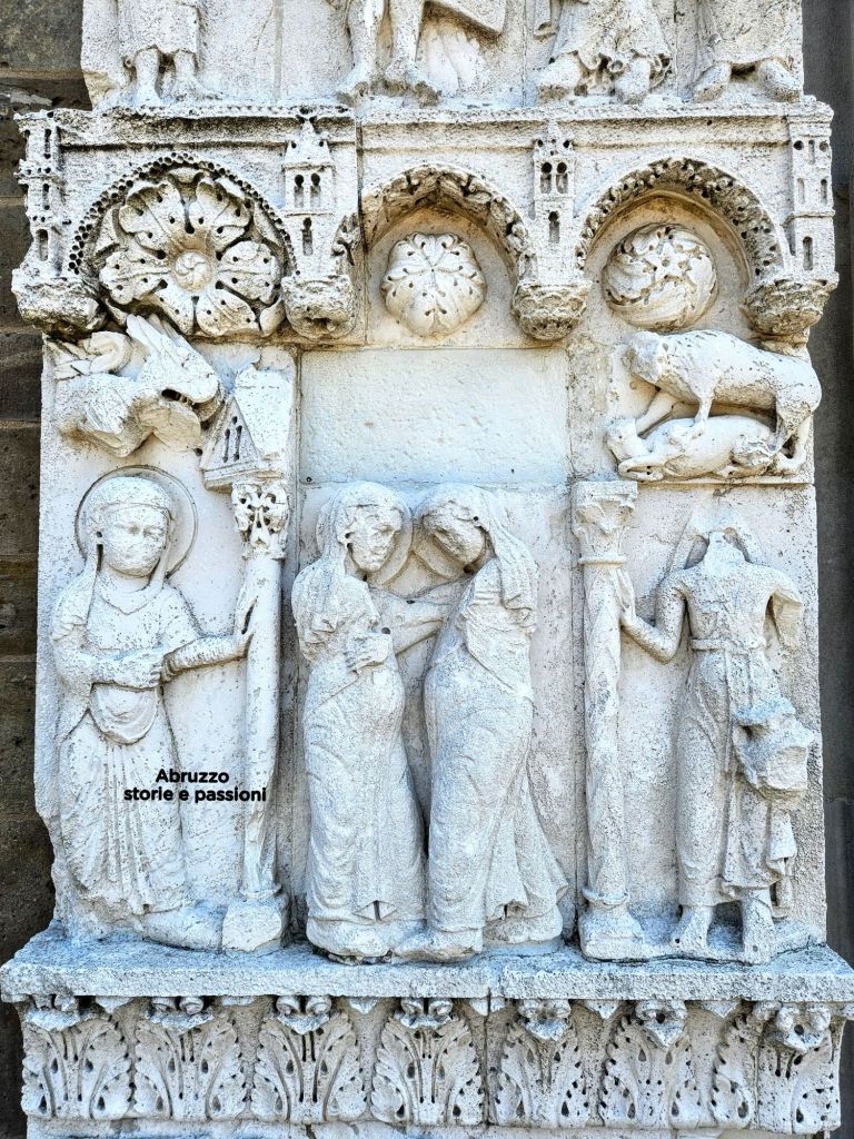 Secondo la mia interpretazione, il dettaglio più significativo è l’anfora che la donna trasporta. L’aveva appena riempita attingendo da una fontana e, quasi casualmente, si trova a testimoniare l’incontro tra le cugine Maria ed Elisabetta. L’acqua, come suggerisce l’ignoto scultore di Fossacesia, diventa simbolo del battesimo, il sacro elemento primario che, sulle acque del Giordano in Galilea, unirà i due predestinati: Gesù di Nazareth e Giovanni Battista.