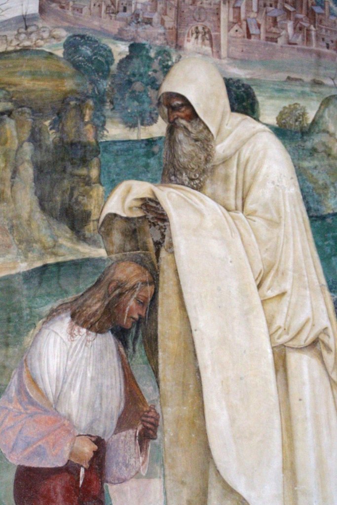 Il monaco Romano veste il giovane Benedetto da Norcia, 1505, Giovanni Antonio Bazzi detto “Il Sodoma” – Monastero di Monte Oliveto Maggiore Asciano – Foto Francesco Bini / Sailko cc‐by-sa, per gentile concessione ad Abruzzo storie e passioni.
