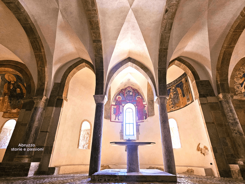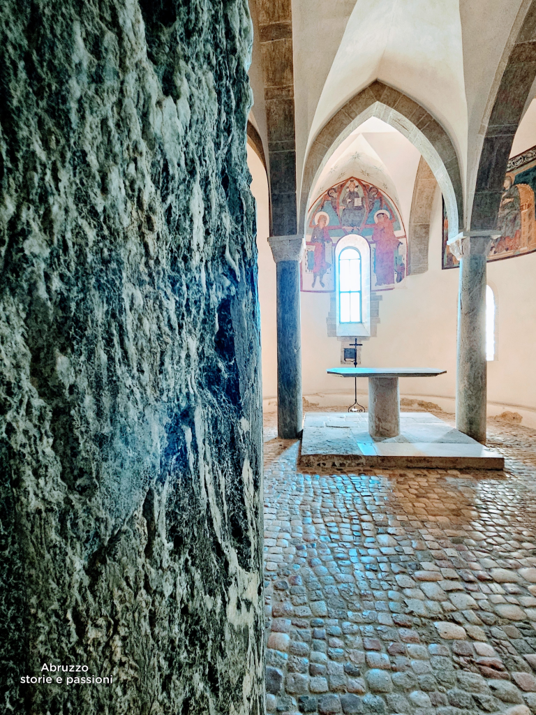 Il principio di trasformazione dei luoghi di culto pagani in spazi cristiani lo avevamo già osservato nell’articolo “I gioielli del Velino”, dedicato ad Alba Fucens. Qui la chiesa di San Pietro in Albe fu costruita sui resti di un tempio dedicato ad Apollo, accessibile attraverso un colonnato a semicerchio affacciato su un panorama che abbracciava l’antica Alba Fucens, le pendici boscose del monte Velino e le propaggini dell’allora Lago Fucino. Le colonne corinzie del tempio, riutilizzate nella navata centrale della chiesa, conferiscono all’interno una luce e una armonia che ne fanno una delle navate più belle dell’Abruzzo.