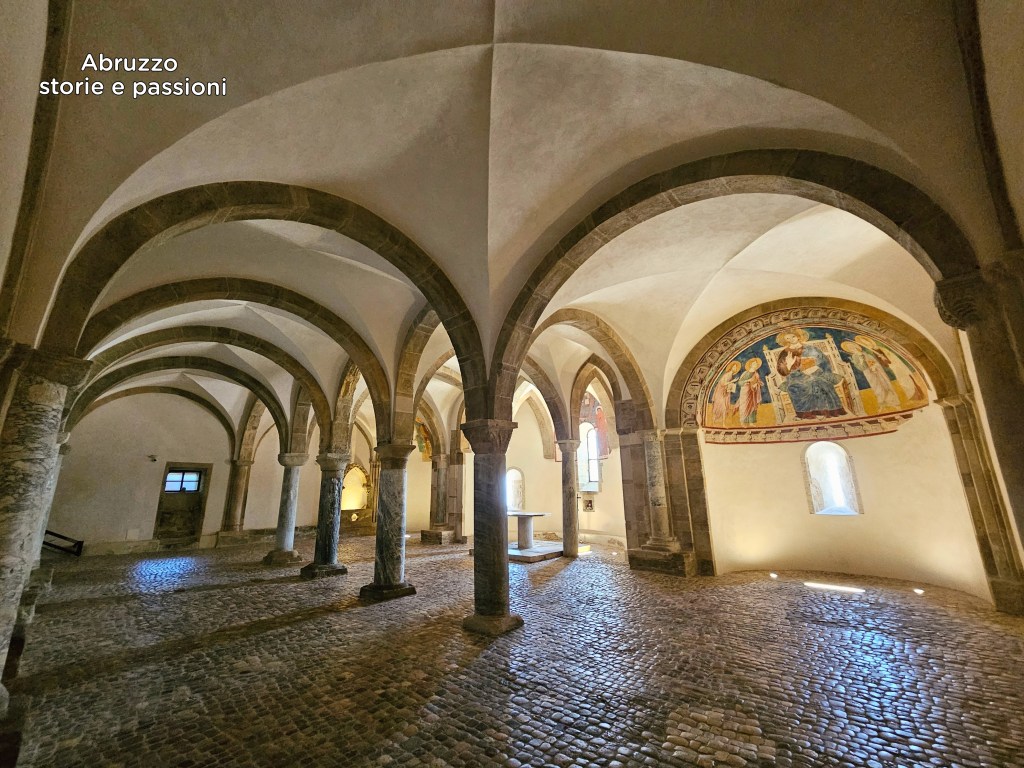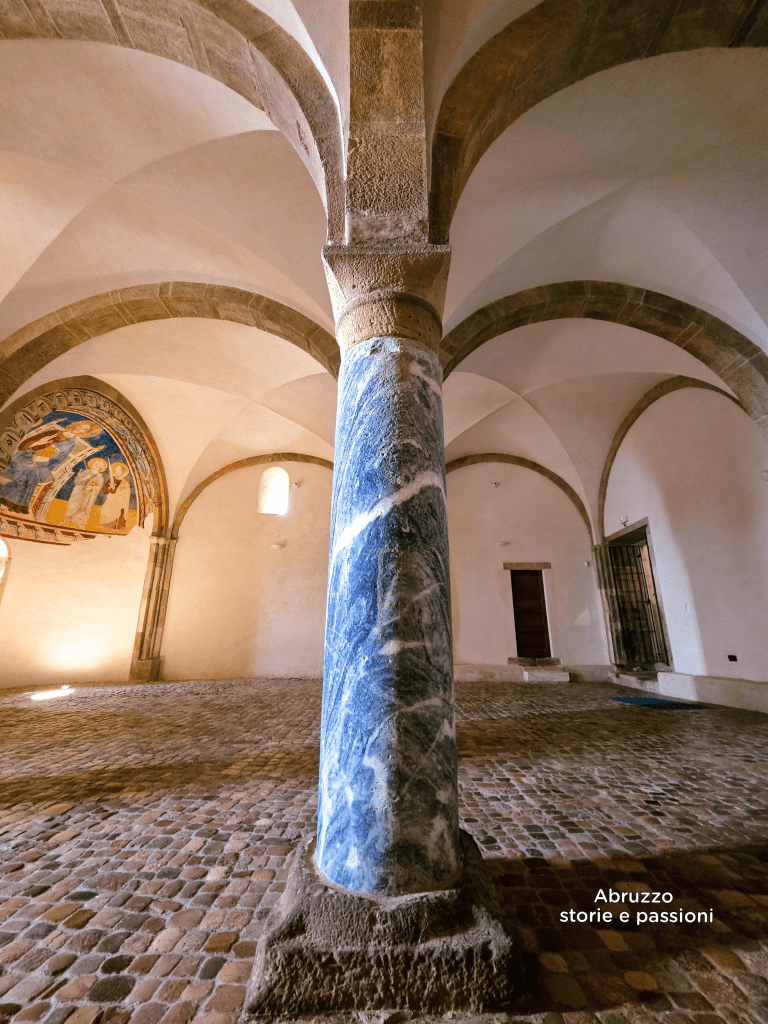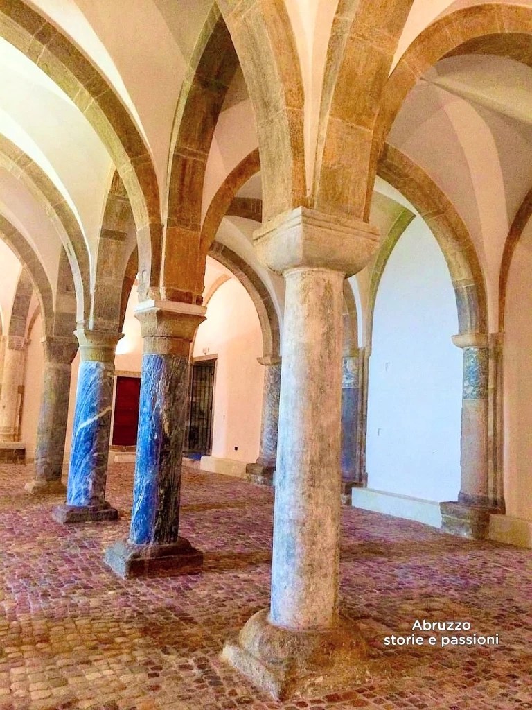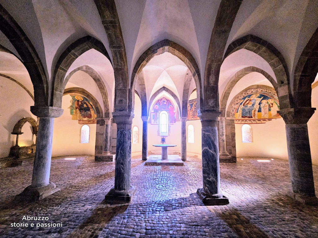 La cripta dell’abbazia non sembra una cripta nel senso tradizionale, considerando la sua notevole altezza. Questo dettaglio avvalora l’ipotesi secondo cui l’edificio originario fosse un luogo di culto costruito sulle rovine del tempio pagano, al quale probabilmente appartenevano le pregiate colonne dalle sfumature marine, tra l’azzurro e il turchese, alternate ad altre in marmo cipollino, dal colore più sobrio e uniforme.