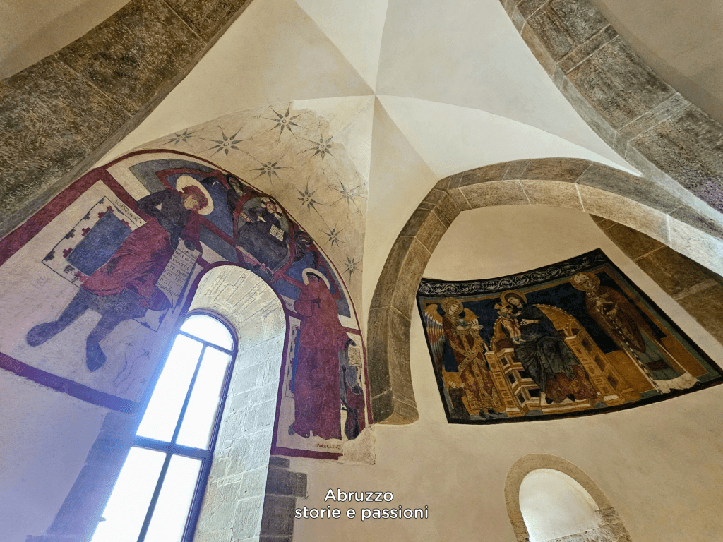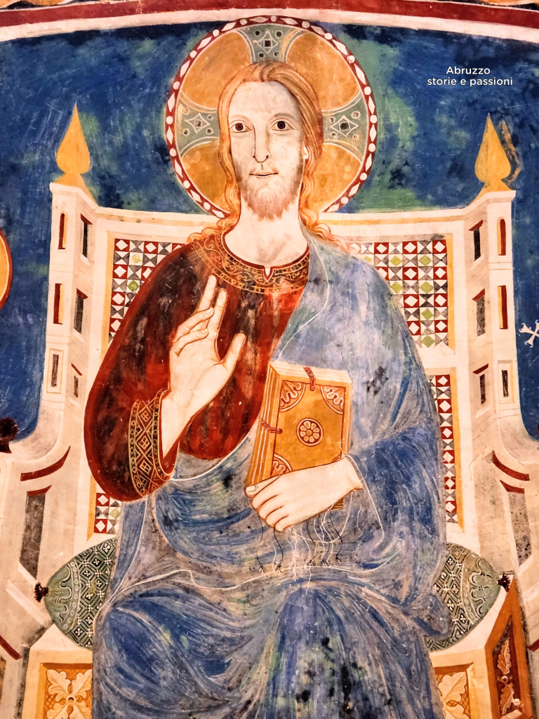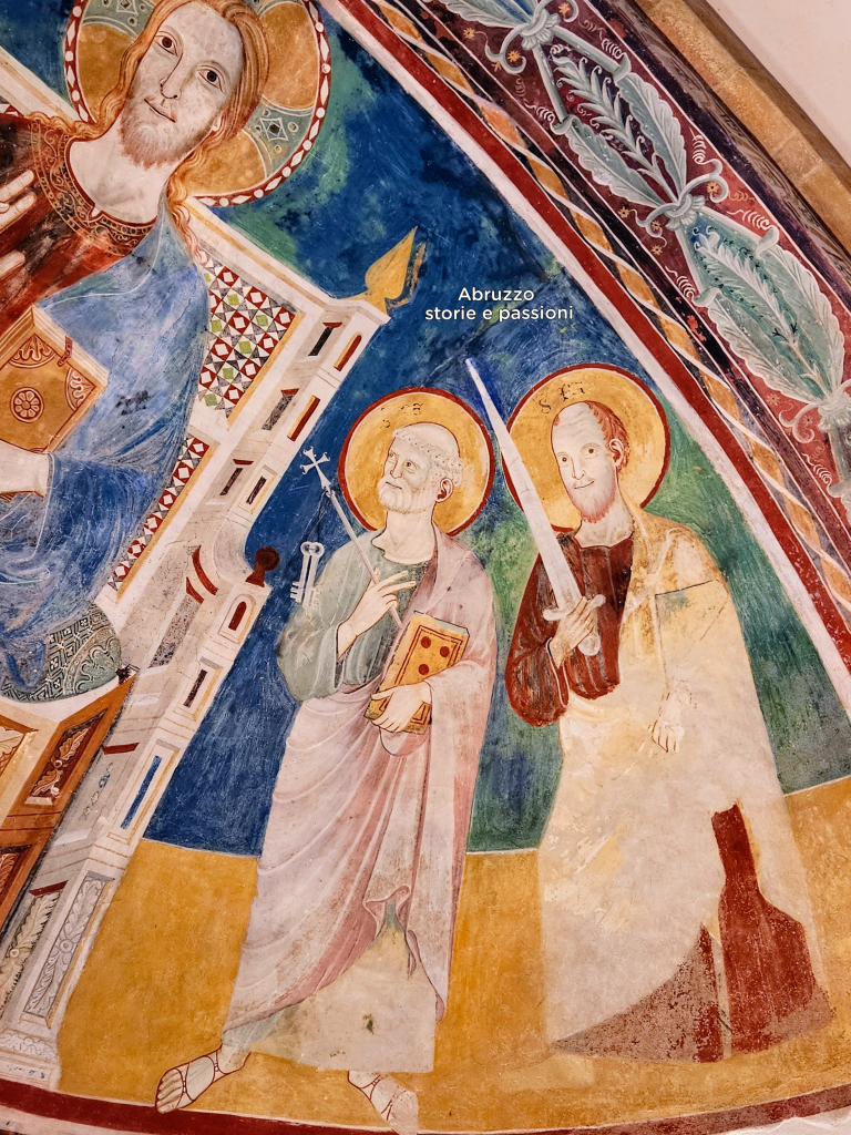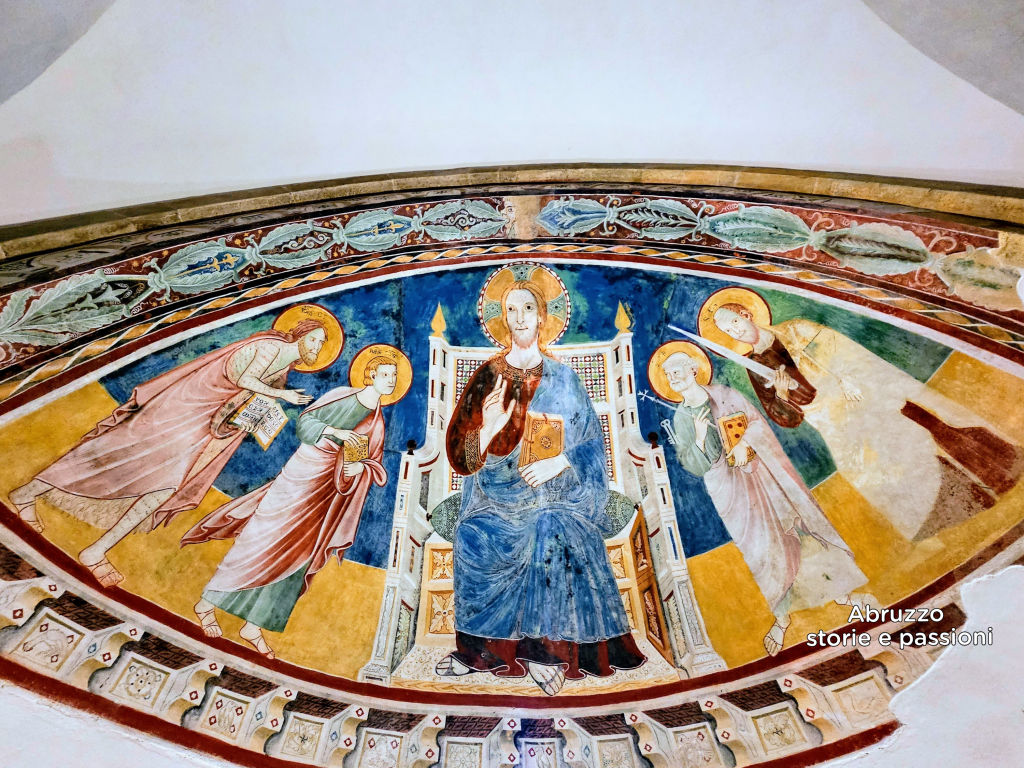 I vivaci colori degli affreschi bizantineggianti illuminano le tre absidi. Datati tra la fine del XIII e l’inizio del XIV secolo, appaiono particolarmente suggestivi nell’abside centrale, dove sembrano più antichi e forse vogliono raccontare, con quelle forme plastiche e quei toni intensi, la persistenza degli influssi bizantini lungo la costa adriatica. Questi elementi, radicati e stratificati, sopravvissero anche alla dominazione longobarda e alla successiva epoca normanna, testimoniando una continuità culturale e artistica che attraversa secoli di storia.