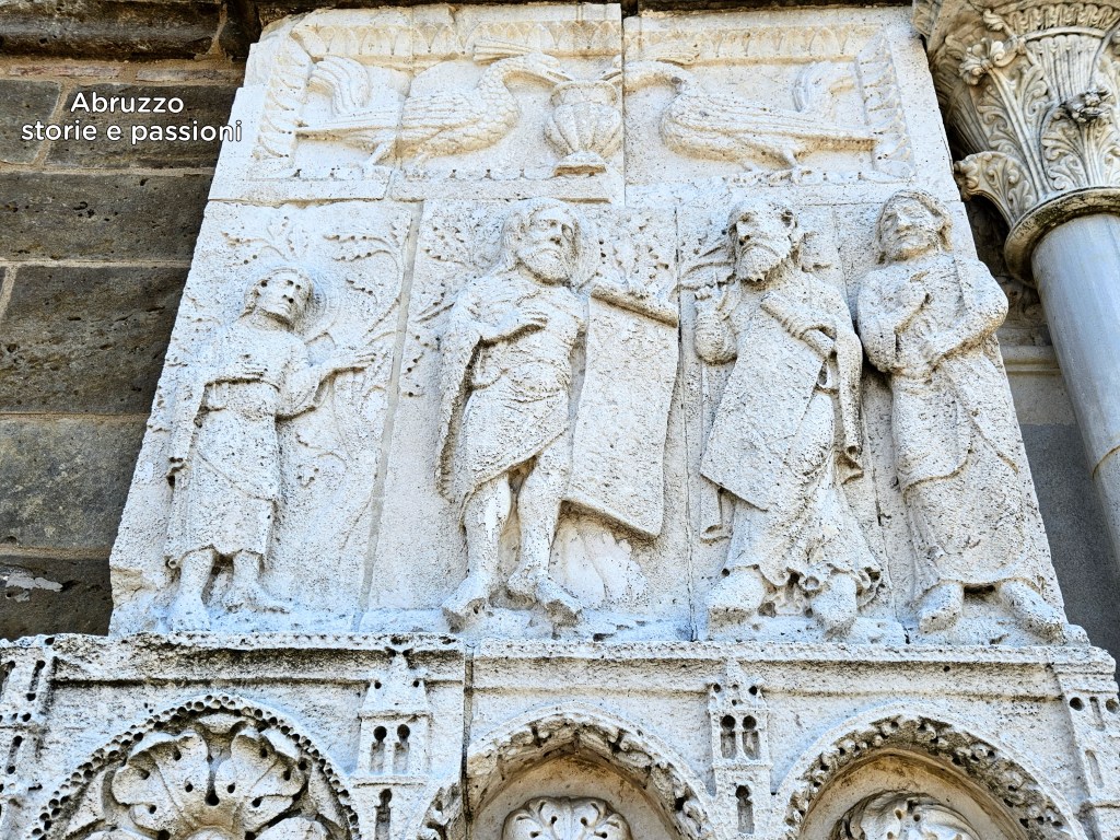Ad esempio, manca la scena del battesimo nel Giordano, e le differenze stilistiche tra la lunetta e i registri istoriati risultano evidenti. Le due colonne corinzie ai lati dei battenti coprono in parte i rilievi, seminascosti, che dovrebbero simboleggiare le tentazioni del male a sinistra e il trionfo del bene a destra, in un richiamo evidente al portale imperiale dell’abbazia di San Clemente a Casauria. I bianchi pannelli marmorei di Fossacesia, invece, si articolano in otto scene: quattro episodi principali tratti dal Vangelo e legati alla vita di San Giovanni Battista, e quattro scene minori, destinate a funzione ornamentale e simbolica.