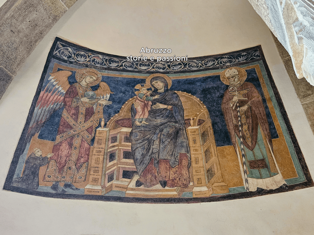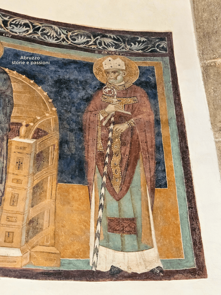 Sulla parete destra dell’abside, lo stile diventa decisamente bizantino. La Madonna, sul cui capo si leggono le lettere greche MP ØV (Madre di Dio), è ritratta in trono con il Bambino. Ai suoi lati figurano San Nicola e San Michele Arcangelo, insieme a un monaco, probabilmente “Augusus”, noto da un’antica iscrizione ormai perduta ma documentata in manoscritti coevi.