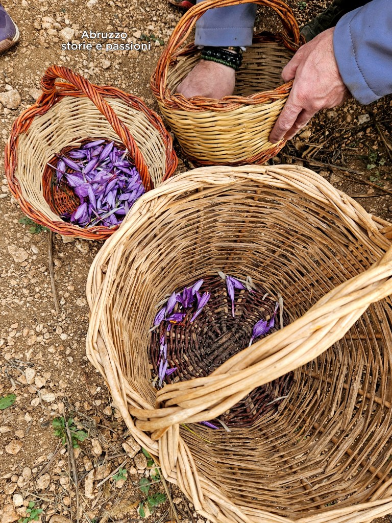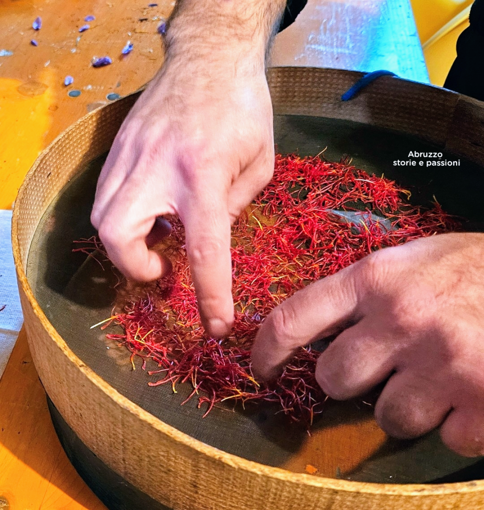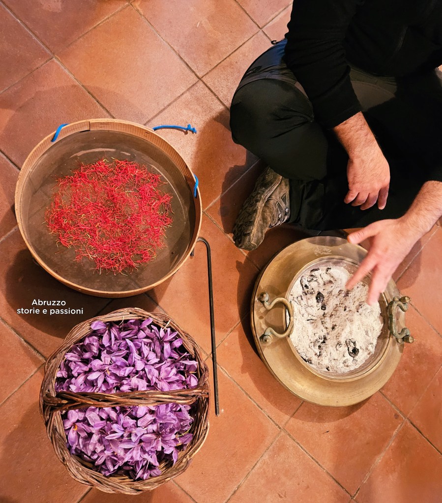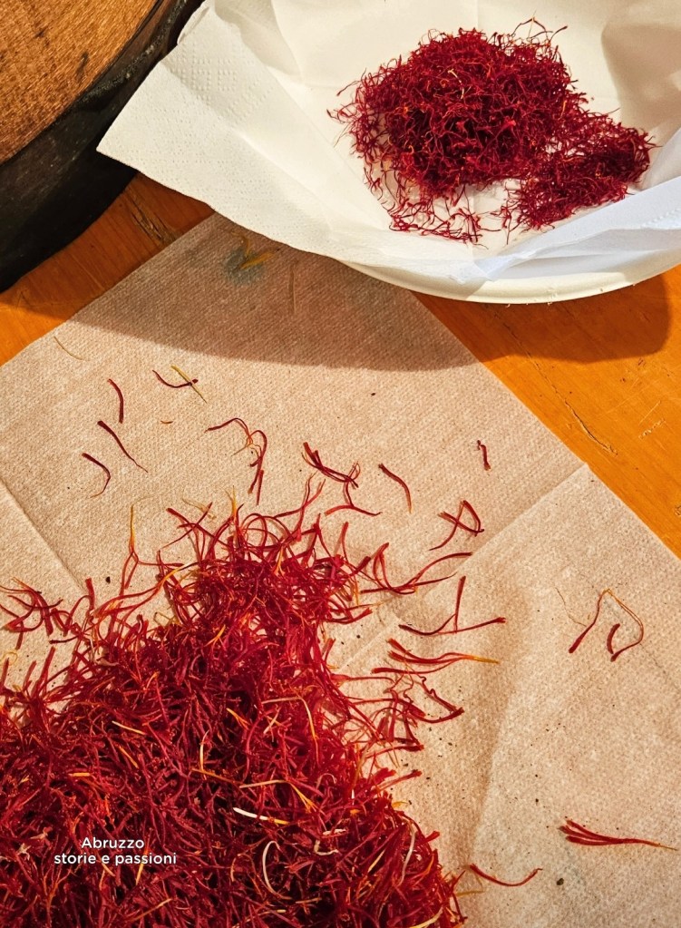 Dopo la raccolta c’è la sfioritura: vengono separati dal fiore le antere gialle e gli stimmi rossi; questi ultimi sistemati in un setaccio da farina per essere essiccati lentamente sopra un braciere di legno di mandorlo o di quercia. In passato la sfioritura era un compito riservato alle donne, esse usavano cantare canzoni popolari durante la lavorazione, inoltre preparavano sacchetti profumati di zafferano per scambiarli, in occasione delle fiere organizzate sui tratturi, con i gioielli della tradizione orafa abruzzese, destinati al corredo delle spose, i cosiddetti “ori di famiglia”.