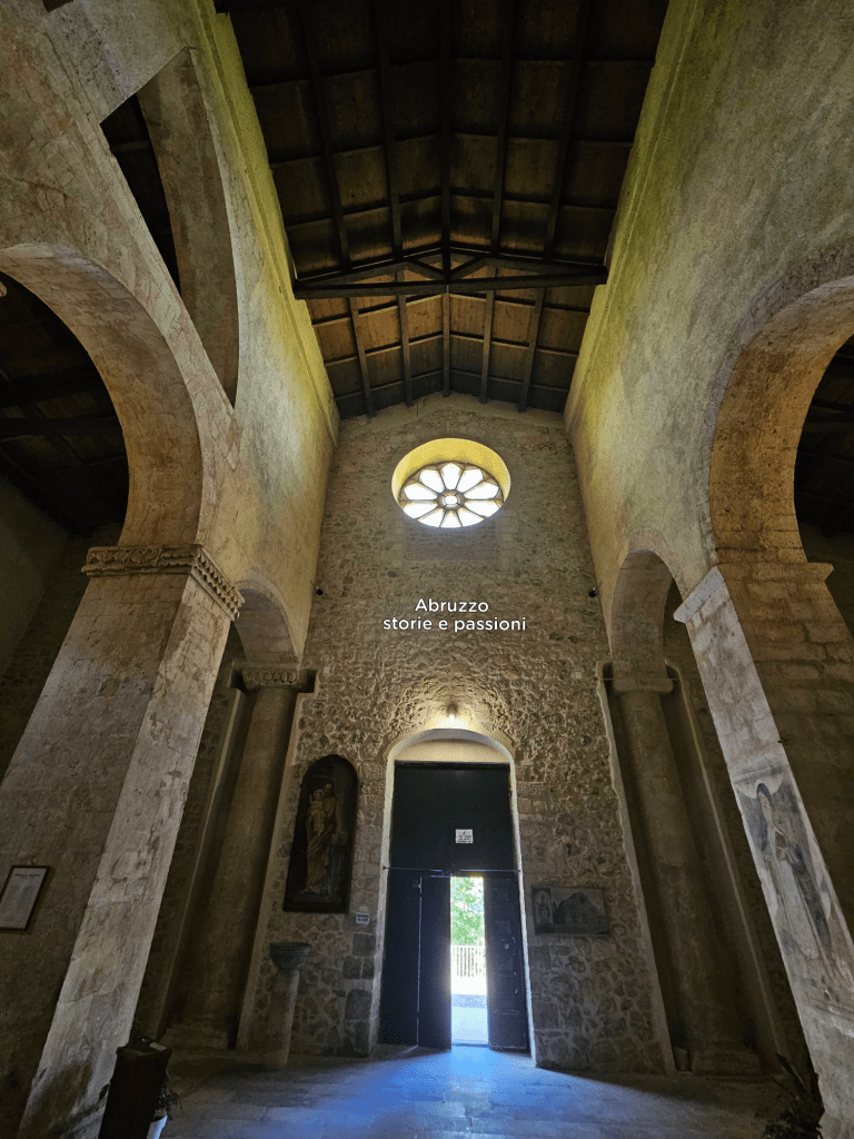 Entrando nella chiesa colpisce l’imponenza delle navate e la profondità dell’aula, che dall’esterno, complice il gioco di prospettive (l’edificio si trova su un piano rialzato rispetto alla strada sottostante), non rende. La stessa percezione l’abbiamo riscontrata entrando nello straordinario oratorio di San Pellegrino a Bominaco, laddove sulla controfacciata campeggia un gigantesco San Cristoforo, che ritroviamo anche qui a Caramanico su una colonna della navata centrale.