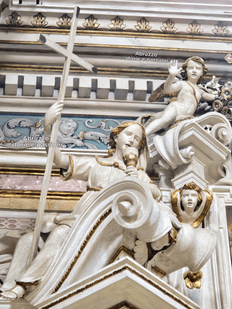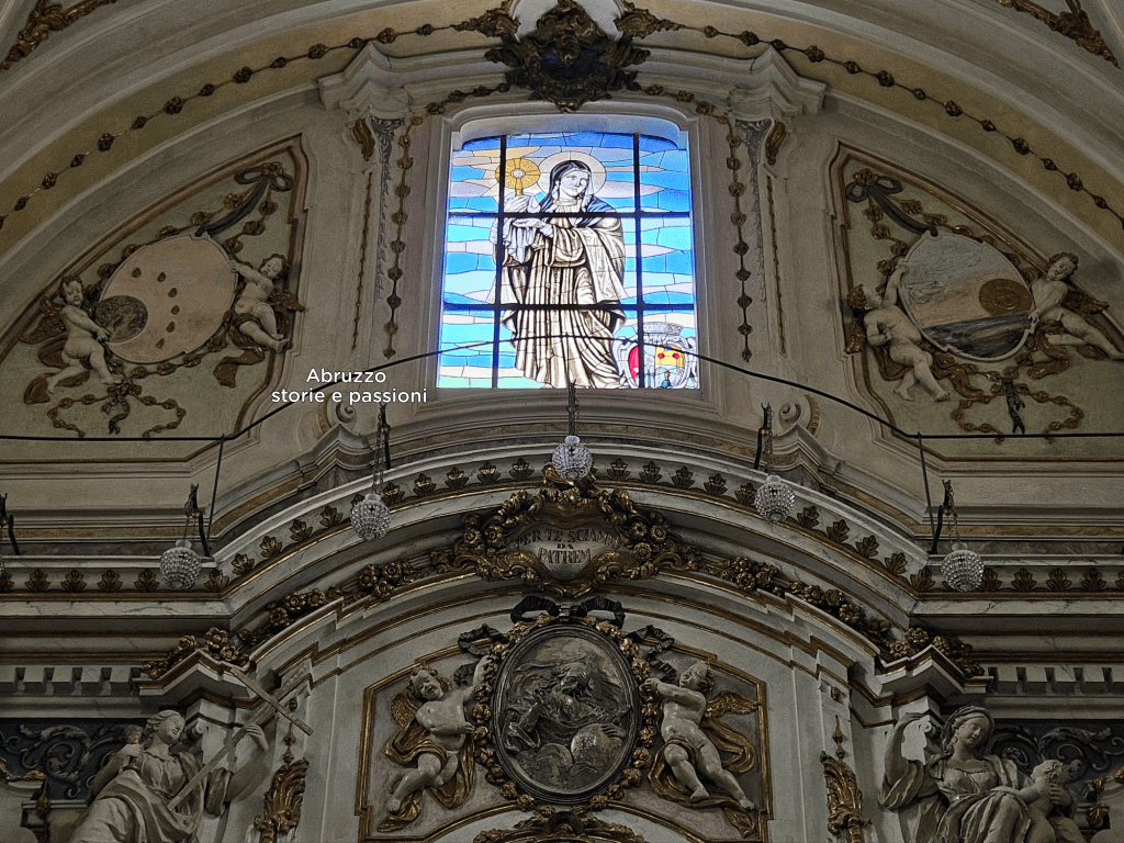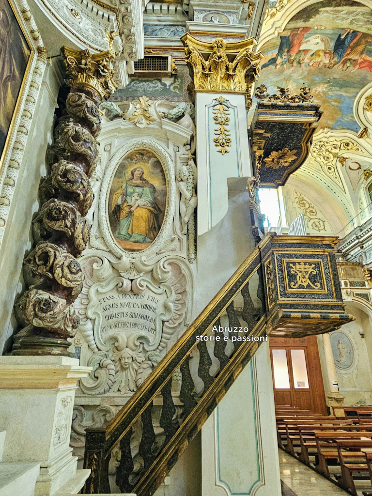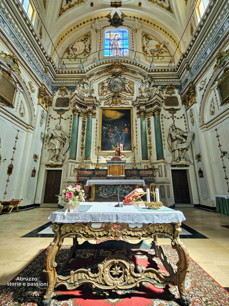 Tra le opere spicca la pala dell’altare maggiore, la Discesa dello Spirito Santo, 1644, firmata da Giovan Battista Spinelli (Chieti, 1613 – Ortona, 1658), artista dalla biografia avvolta nel mistero e già protagonista di un articolo in questo blog. Ai suoi lati si trovano le statue di due profeti. Sulla volta domina l’affresco ottocentesco del chietino Raffaele Del Ponte che raffigura l’Assunzione di Maria in cielo, circondata da angeli e contemplata dagli apostoli, intenti a raccogliere le rose – simbolo del Rosario – cadute dal cielo.