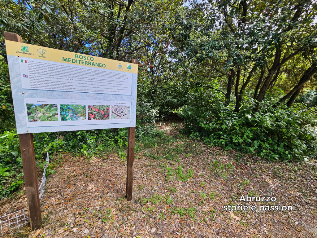 È il primo e vero bosco che si afferma dietro la fascia arbustiva della macchia mediterranea. Il bosco è composto quasi esclusivamente da Leccio, una quercia sempre verde che in questo viaggio sulla Costa dei Trabocchi abbiamo già conosciuto nella Lecceta di Torino di Sangro, una estesa riserva naturale. Oltre al leccio in questa prima fascia del Giardino Botanico sono presenti cespugli di pungitopo e il Viburno, una pianta con grandi fiori bianchi profumati che in autunno si trasformano in grappoli di frutti blu particolarmente apprezzati diversi volatili. Questo habitat è adatto per la testuggine di terra e il serpente Cervone, totalmente innocuo per gli umani ma fondamentale per mantenere l’equilibrio naturale.