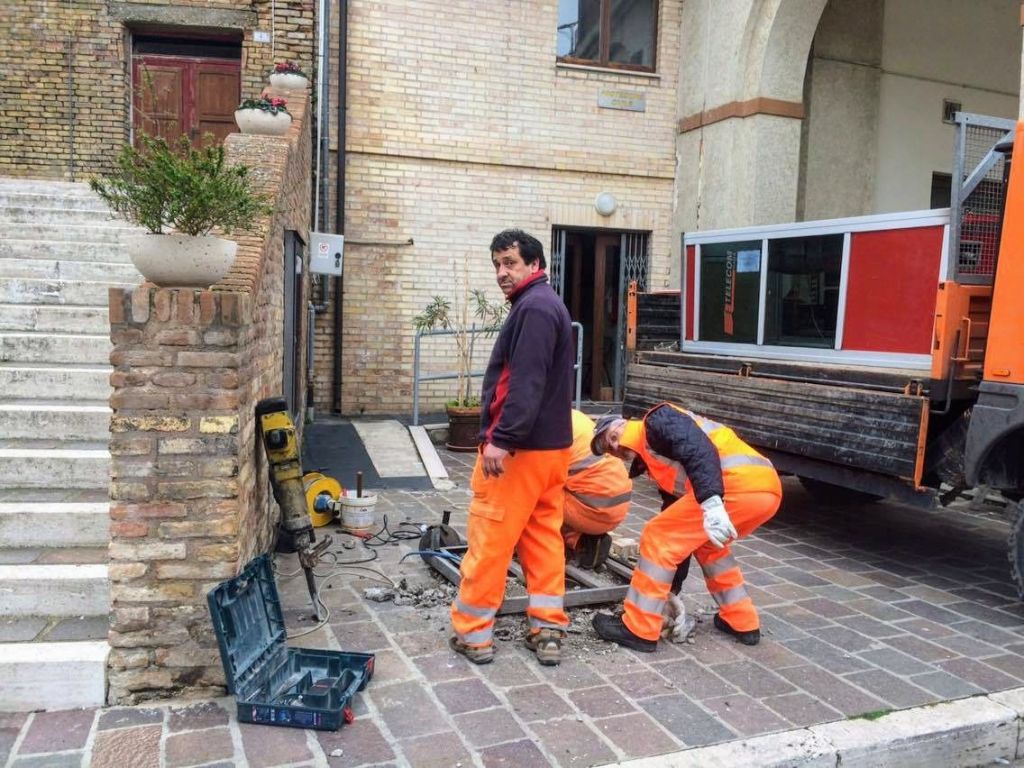Ripa Teatina, Torre di Porta Gabella, gli operai del Comune rimuovono una vecchia cabina telefonica ‐ Foto Barbara Birindelli